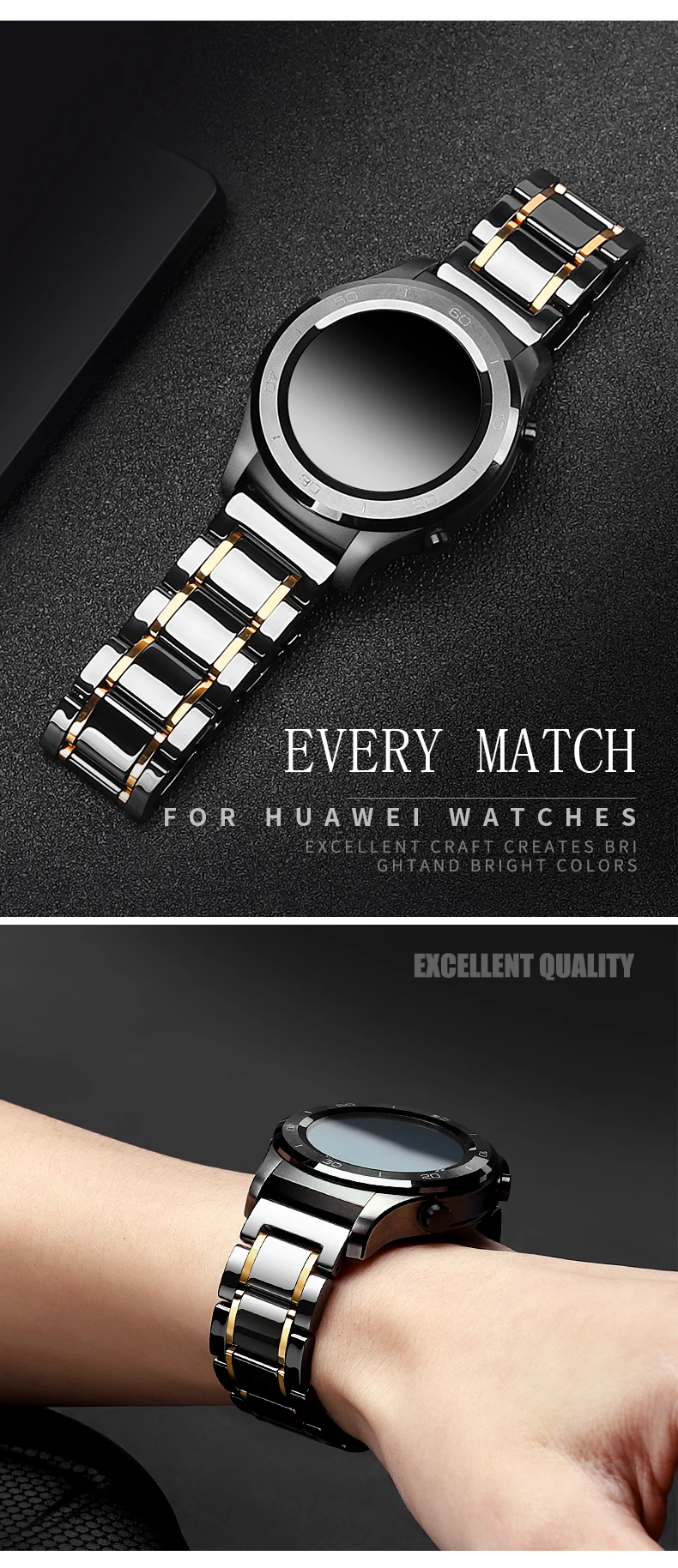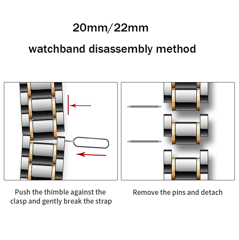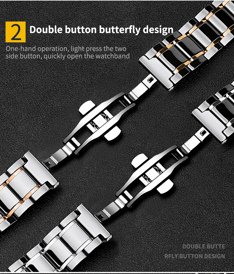 Ремешок изготовлен из керамики и нержавеющей стали. -Быстросъемный дизайн: высококачественная керамическая лента для часов с быстросъемным дизайном, элегантная, Модная и удобная в носке. С быстроразъемным пружинным стержнем просто установите и отсоедините ленту вручную, никаких инструментов не требуется; 3 Быстросъемных контакта в комплекте (2 для прямого использования и 1 для запасных частей). -Регулируемая длина: все керамические звенья снимаются, очень легко снимаются, чтобы изменить размер длины ремешка, чтобы идеально подогнать запястье. В комплект входит инструмент для удаления звеньев. Подходит для всех запястья размером меньше 8,6 дюйма (220 мм). Длина ремешка: 6,7 дюйма (170 мм) длина ремешка может быть увеличена, чтобы удовлетворить (большое запястье руки) потребителя, толщина: 3,8 мм, вес: около 2,8 унции.(80 г). -Серебристая застежка-бабочка из нержавеющей стали: Высококачественная застежка-бабочка из нержавеющей стали с двойной кнопкой позволяет быстро снять и снять ремешок. Застежка/пряжка с двумя кнопками обеспечивает безопасность Ваших часов и с помощью «клика» быстро отпустите и закройте.