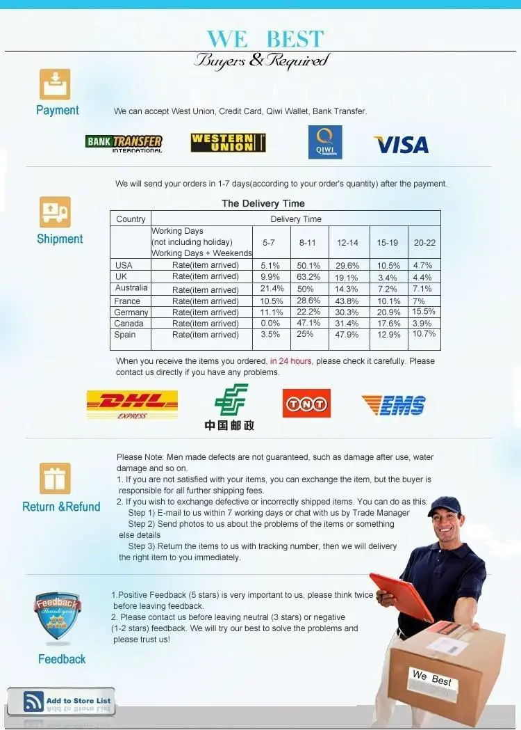 Бесплатная доставка EMS или Почта Китая. (другие способы доставки являются необязательными, но клиенты должны оплатить стоимость доставки. Клиенты должны оплатить некоторые таможенные пошлины для некоторых стран, пожалуйста, будьте в курсе этого.)