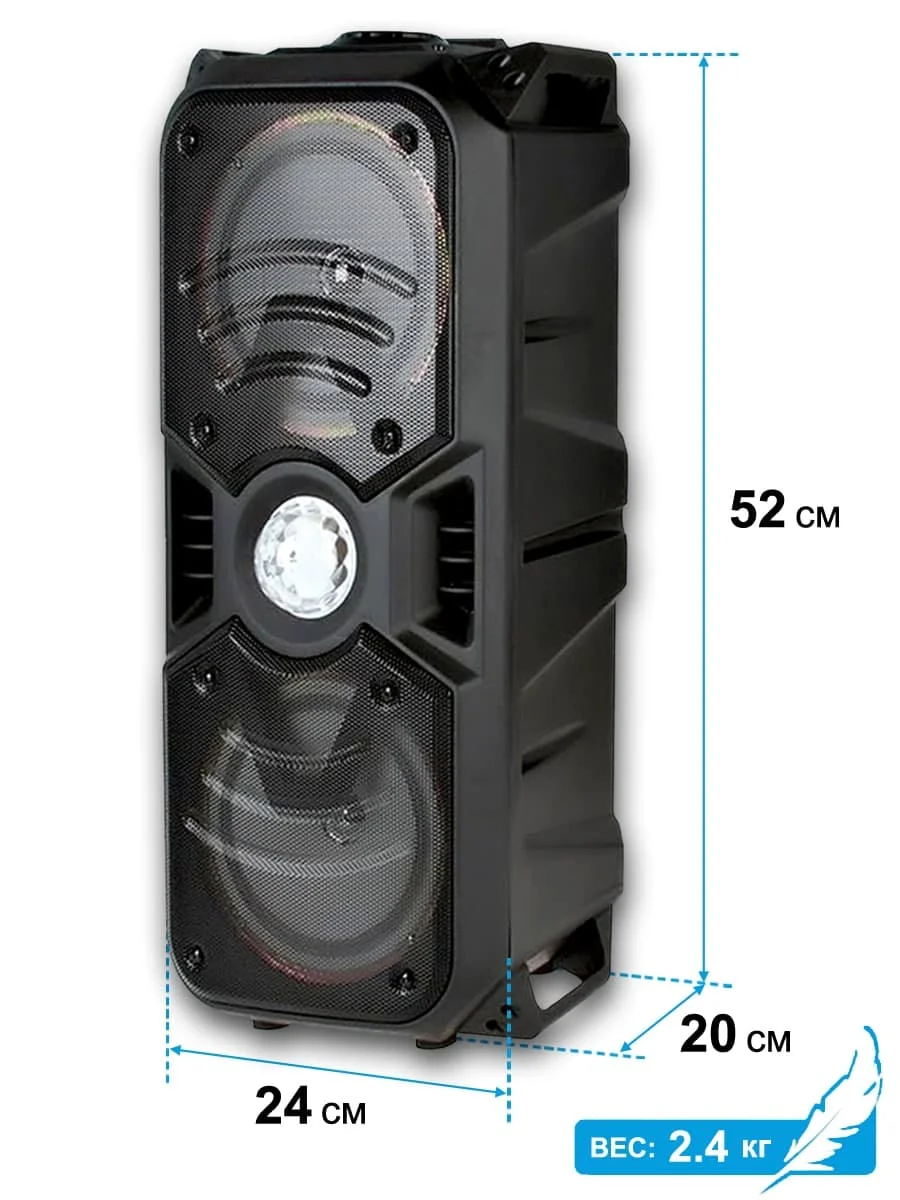 Bluetooth с микрофоном и яркой подсветкой. Колонка имеет мощный и чистый стерео звук. Глубокое звучание низких частот. Интерфейс для прослушивания FM-радио.Поддержка воспроизведения с TF карт и USB флешек. Bluetooth-соединение с любыми устройствами, имеющими Bluetooth модуль, в том числе с iPhone, iPod, iPad и т.д. AUX режим для подключения к любым устройством со стандартным разъемом 3.5 мм. (телефоны, планшеты, ПК, плееры и др.) Встроенный мощный литий-ионный аккумулятор и микрофон в комплекте. Режимы воспроизведения: - Bluetooth - Внешний накопитель - Aux - FM Питание: - MicroUSB 5V DC - Встроенный аккумулятор 4000 mAh (до 5 часов работы) Разъемы: - USB - microSD - Jack 6.3 мм (микрофон) 1 шт. Комплектация: - Микрофон проводной 1 ш. - Пульт Д/У - Кабель MicroUSB Дополнительно: Дисплей LED подсветка динамика (активная) Дополнительные ручки для переноски Легкий вес