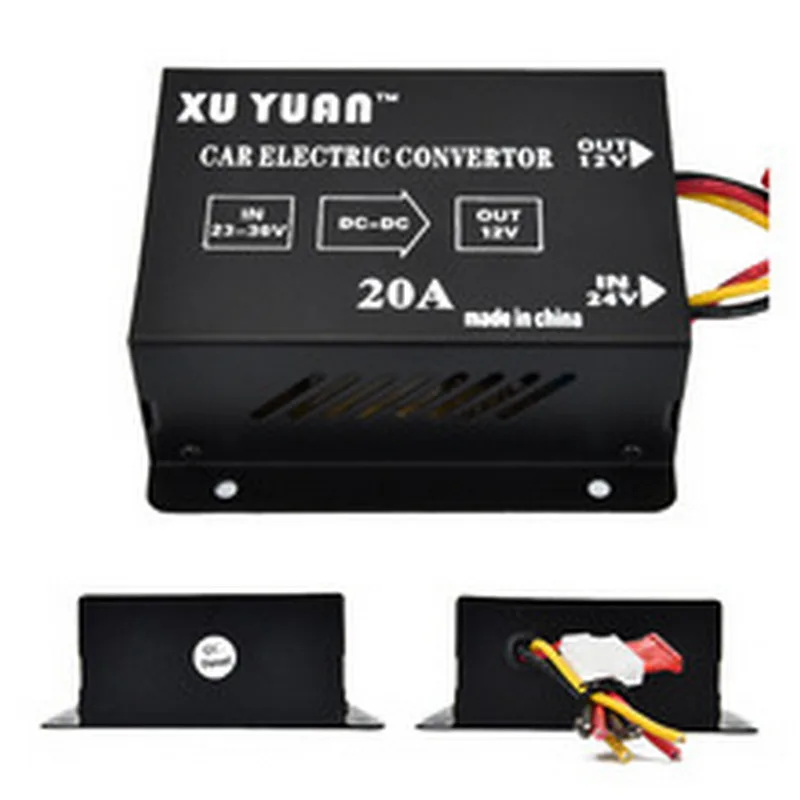 Автомобильный инвертор 24->12v Преобразователь напряжения 24/12V 20А - преобразователь напряжения служит для преобразования напряжения 20-30В в напряжение 14В и предназначен для автомобилей с номинальным напряжением бортовой сети 24В. Высокий максимальный ток нагрузки (10А) позволяет подключать различные, как маломощные (ТВ-приемник, радар-детектор, радиостанцию и др.), так и мощные потребители тока (магнитолу, холодильник, подогрев сидений и др.). Также возможно подключение ручного электроинструмента.