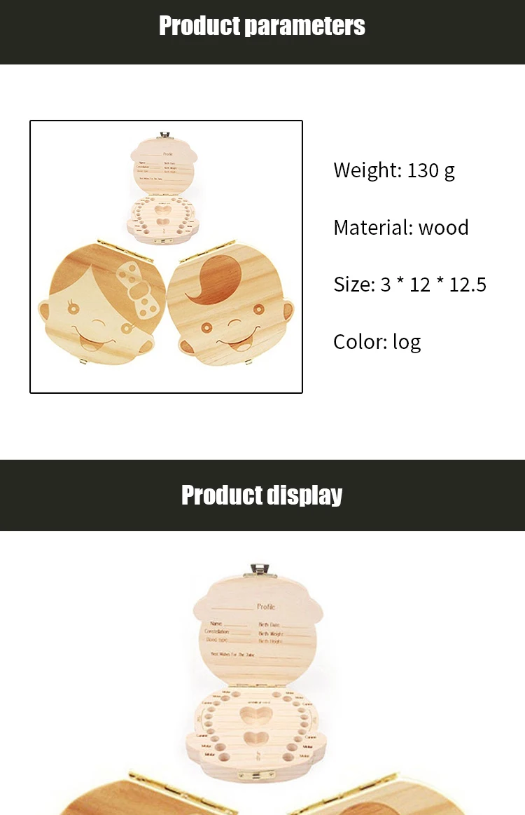 ** Каждый лиственный зуб уникален для ребенка, потому что он сохраняет незабываемые моменты о росте ребенка. ** Соберите детские зубы, Подарите вашему ребенку прекрасные детские воспоминания. Описание: Зубная коробка Деревянный ребенок сохранить молочные зубы Материал: дерево Размер: 12,3*12,5*3 см Стиль: изображение для девочки/изображение для мальчика Вес: 170 г Языки: английский, русский, испанский, немецкий, французский, голландский, итальянский, португальский Как обработать зуб ребенка: Шаг 1: как правило, с 6 лет дети начинают падать молочные зубы. Шаг 2: Не забудьте повторно использовать зубы у доктора. Шаг 3: стерилизовать извлекаемые зубы. Положите извлекаемый зуб в кипящую воду около пяти минут. Шаг 4: натуральные сухие зубы. Стерилизованные Зубы должны быть помещены в место с хорошей вентиляцией. Шаг 5: ведите запись. Запишите соответствующую информацию
