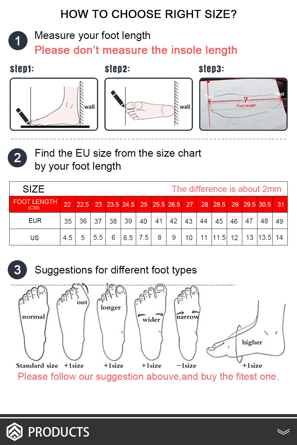 Важное примечание: Длина стопы не соответствует длине стельки. Длина стопы не соответствует длине подошвы. Длина стопы <длина стельки <длина подошвы Европейский размер 35 = американский размер 4,5 = длина стопы 22 см Европейский размер 36 = американский Размер 5 = длина стопы 22,5 см Европейский размер 37 = американский размер 5,5 = длина стопы 23 см Европейский размер 38 = американский размер 6 = длина стопы 23,5 см Европейский размер 39 = американский размер 6,5 = длина стопы 24,5 см Европейский размер 40 = американский размер 7,5 = длина стопы 25 см Европейский размер 41 = американский Размер 8 = длина стопы 25,5 см Европейский размер 42 = американский размер 9 = длина стопы 26,5 см Европейский размер 43 = американский размер 10 = длина стопы 27 см Европейский размер 44 = американский размер 11 = длина стопы 28 см Европейский размер 45 = американский размер 11,5 = длина стопы 28,5 см Европейский размер 46 = американский размер 12 = длина стопы 29 см Европейский размер 47 = американский размер 13 = длина стопы 29,5 см Европейский размер 48 = американский размер 13,5 = длина стопы 30,5 см Европейский размер 49 = американский размер 14 = длина стопы 31 см