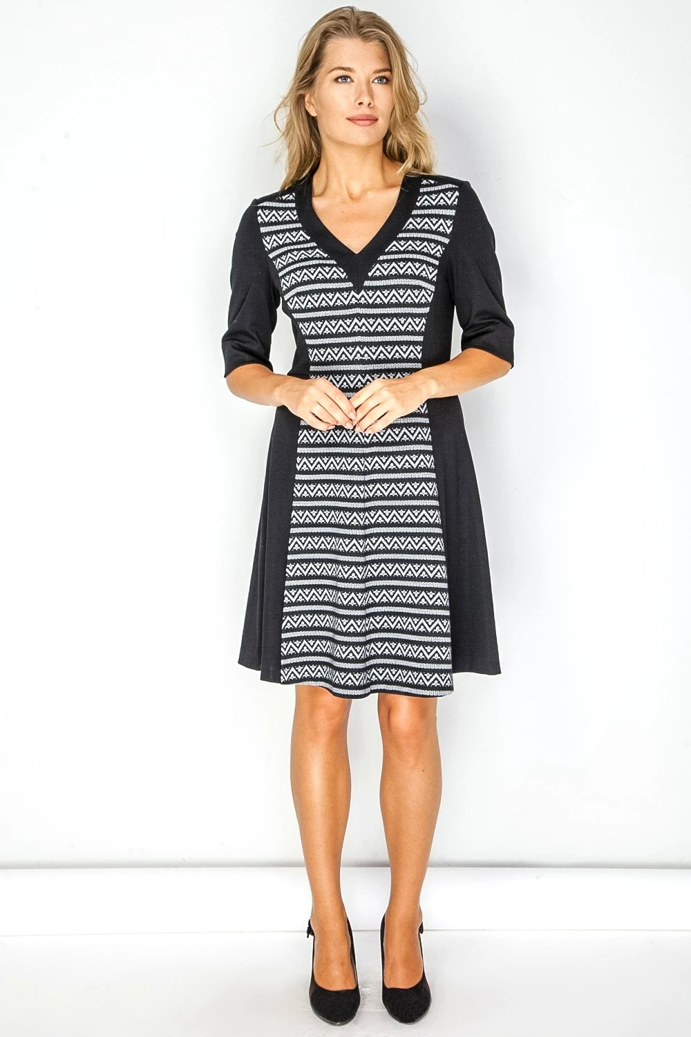 Комбинированное платье из трикотажного полотна полуприлегающего силуэта, расширенного к низу. Изделие до середины колена, с втачными рукавами длиной до локтя с разрезами по низу. Фигурная линия горловины с декоративной планкой. Перед с фигурными рельефами. Центральная часть переда выполнена из мелкоузорчатой ткани с геометрическим узором. В среднем шве спинки обработана застежка на потайную молнию. Платье оригинального дизайна на каждый день.