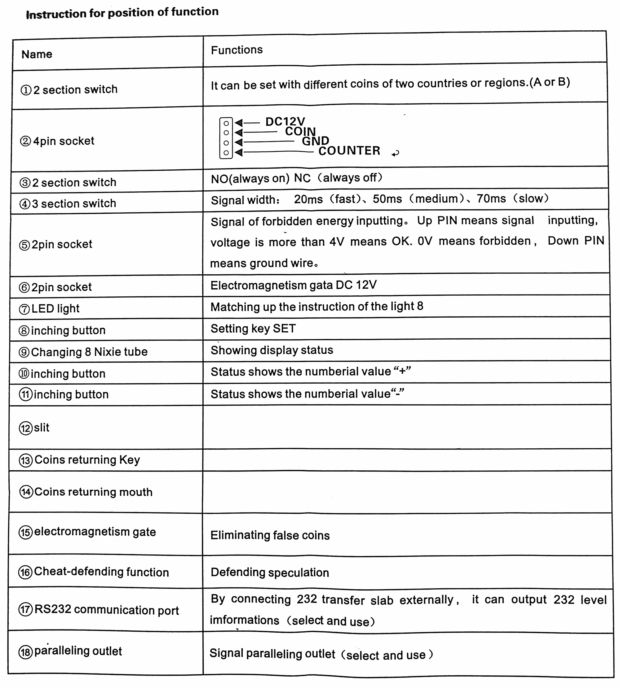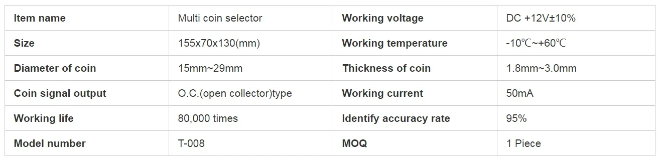 1.Capable of accepting all worldwide coins and tokens. 2.Intelligent CPU software control, and high accuracy. 3.Accept different kinds of coins at the same time. 4.Free to set up pulses output. 5.Prevent not only electric shock but also electromagnetic interference. 6.Automatic self-test for problems. 7.Support coins with only one signal output.