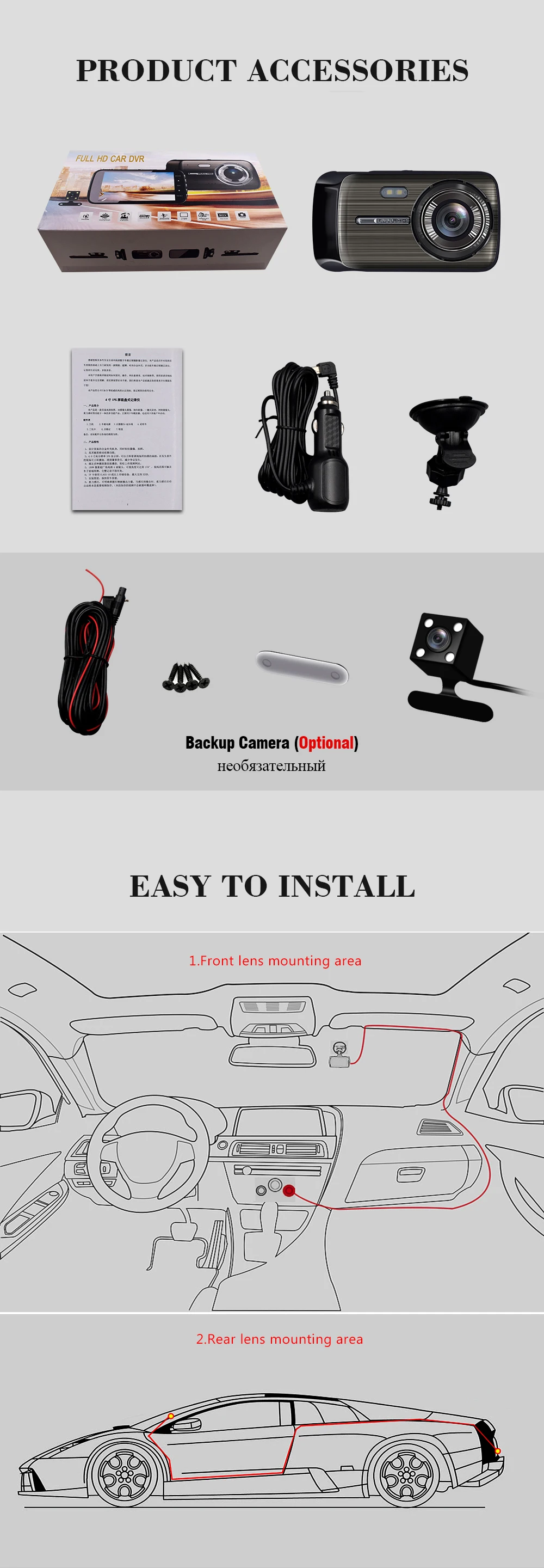 Фронтальная камера DVR и камера заднего вида могут делать запись одновременно и имеют два раздельных дисплея. фронтальная камера Full HD 1080 P с широкоугольным углом 170 градусов и тыловой камерой 720 P с углом 120 градусов.