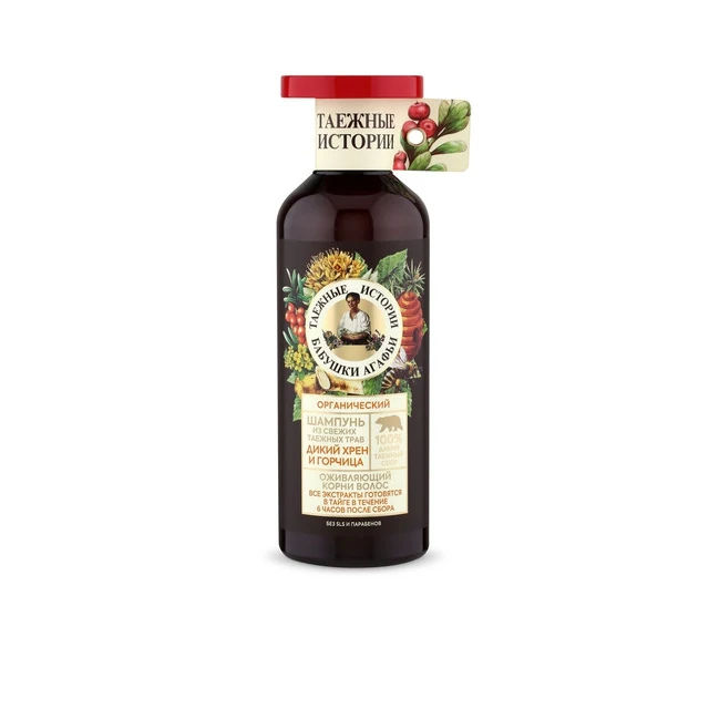 Состав: Aqua with infusions of Organic Cochlearia Armoracia Root Extract (органический экстракт дикого хрена), Organic Sinapis Arvensis Flower Extract (органический экстракт белой горчицы), Organic Saponaria Officinalis Root Extract (органический экстракт мыльного корня), Organic Depuratus Mumijo Extract (органический экстракт алтайского мумиё), Organic Rhodiola Rosea Root Extract (органический экстракт родиолы розовой), Organic Eleutherococcus Senticosus Root Extract (органический экстракт сибирского корня женьшеня), Organic Nepeta Sibirica Extract (органический экстракт котовника сибирского), Organic Chamomilla Recutita Flower Extract (органический экстракт ромашки), Organic Achillea Millefolium Flower Extract (органический экстракт тысячелистника); Sodium Coco-Sulfate, Glycerin, Decyl Glucoside, Cocamidopropyl Betaine, Organic Pinus Sibirica Seed Oil (органическое масло кедра), Sodium Chloride, Coco-Glucoside, Organic Hippophae Rhamnoides Fruit Oil (органическое масло таежной облепихи), Guar Hydroxypropyltrimonium Chloride, Citric Acid, Benzyl Alcohol, Benzoic Acid, Sorbic Acid, Aroma (натуральный ароматизатор горчицы и полыни), Caramel.