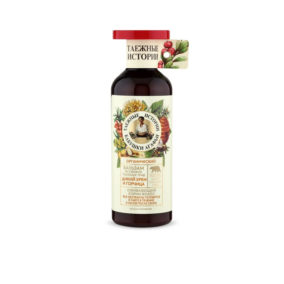 Ingredients: Aqua with infusions of organic Cochlearia armoracia root extract (organic extract wild HRP), organic Sinapis arvensis flower extract (organic extract white mustard), organic depuratus mumijo extract (organic extract алтайского Mummy), organic Rhodiola rosea root extract (organic extract Rhodiola Rose), organic Eleutherococcus senticosus root extract (Organic extract сибирского root ginseng), organic Nepeta sibirica extract (organic extract котовника сибирского), organic Chamomilla recutita flower extract (organic chamomile extract), organic Achillea millefolium flower extract (organic extract тысячелистника); Cetearyl alcohol, distearoylethyl dimonium chloride, organic Pinus sibirica seed oil (organic oil cedar), glycerin, Organic Hippophae rhamnoides fruit oil (organic oil таежной seabuckthorn), guar hydroxypropyltrimonium chloride, hydroxyethylcellulose, lauryl glucoside, citric acid, organic Pinus pumila twig leaf oil (organic oil Cedar стланика), benzyl alcohol, benzoic acid, sorbic acid, aroma (natural flavor of mustard and wormwood), caramel.