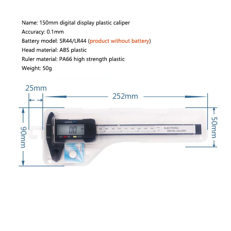 Пластиковый штангенциркуль с цифровым дисплеем 150 мм (продукт без батареи)