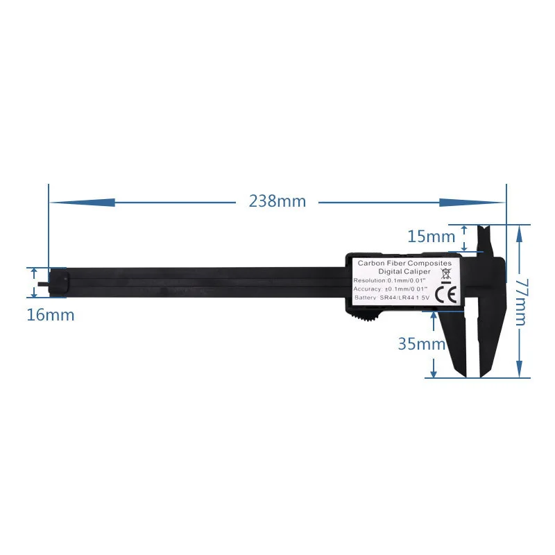 Точность: 0,1 мм Модель аккумулятора: SR44/LR44 (изделие без аккумулятора) Материал головки: АБС-пластик Материал линейки: Высокопрочный пластик PA66 Вес: 50 г