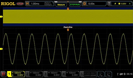 Серия MSO5000 предоставляет не более 8 GSa/s частота дискретизации в реальном времени и коэффициент частоты дискретизации/полосы пропускания 23X для полосы пропускания 350 МГц, что намного опережает продукты такого же уровня. Сохраняя сверхвысокую частоту дискретизации в 8 Гвыб/с, серия MSO5000 также имеет глубину памяти до 200 Мбит/с, что позволяет запечатлеть больше событий за одно приобретение. Это обеспечивает пользователям достаточное время для наблюдения, в значительной степени сохраняя сведения о форме волны. Таким образом, пользователи могут не только получить подробную информацию о волнах, но и сделать обзор волновых форм.