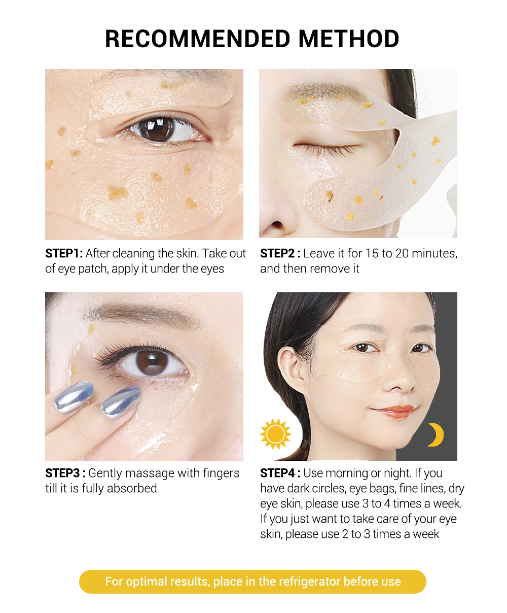 1. После очистки области вокруг глаз, возьмите маску с ложкой 2. Нанесите 15-210 мин., чтобы кожа полностью впитала питательные вещества 3. Раскройте патчи для глаз и аккуратно массируйте, пока не впитается излишняя эссенция. Примечание: 1. Если есть какие-либо дискомфорта, пожалуйста, прекратите его использование немедленно. 2. Хранить этот продукт в недоступном для детей месте. 3. Избегайте хранения светильник при комнатной температуре.