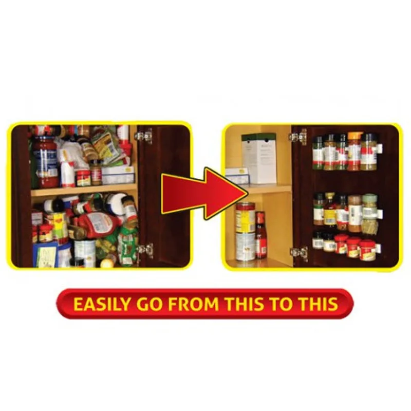 Претензию Зажим крепится к любой поверхности. Они идеальны рядом с плитой, поэтому вы можете быстро получить доступ к специям во время приготовления пищи. Вы также можете прикрепить их к холодильнику или к любым неиспользованным местам, которые вы можете использовать. Каждый зажим съемный, так что вы можете настроить их, чтобы соответствовать любому пространству и месту. Это не только для специй. Используйте зажим для организации бутылочек по рецепту, чтобы вы могли получить больше места в вашем шкафчике для лекарств. В конце концов, вы можете снять загромождение Ваших принадлежностей для изготовления и привести в порядок Ваш стенд для инструментов. Быстро и легко увеличивайте пространство на полках с помощью зажима.
