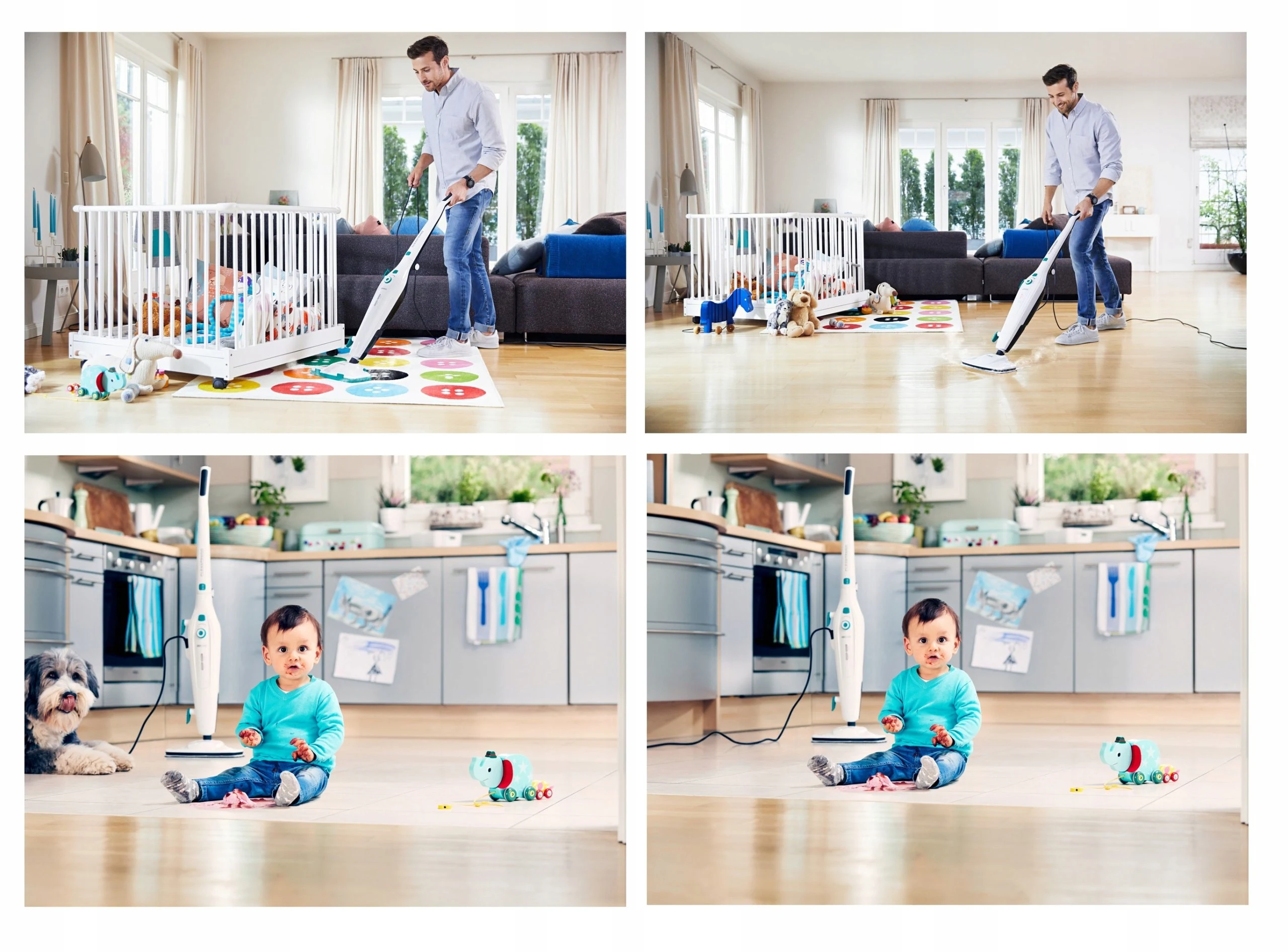 - без каких-либо химикатов. Горячий пар удаляет до 99,99% бактерий и микробов, что делает его незаменимым средством, например, когда дети играют на полу.