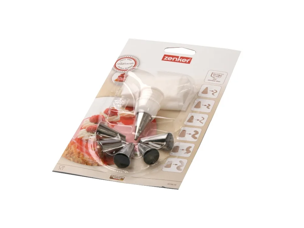 Прост в обращении: в мешок изнутри вставляется основа для насадок с резьбой, снаружи к резьбе прикручивается любая из пяти насадок. Краткую инструкцию по использованию можно также найти на оборотной стороне упаковки. Насадки и мешок легко моются под струей воды. Незаменим для тех, кто любит праздничную выпечку и работу с кремами.