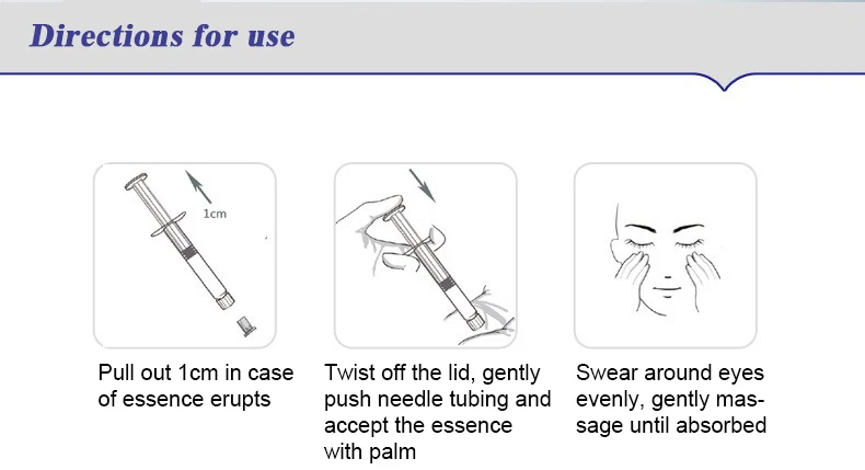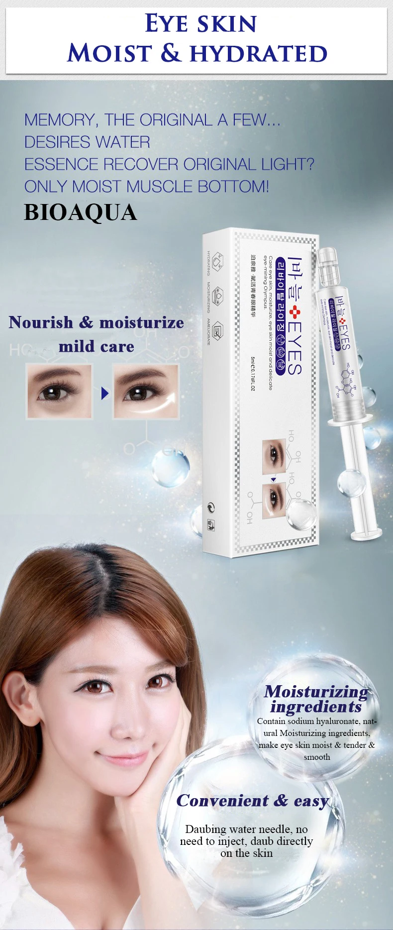 Информация о продукте Название: эссенция для глаз BIOAQUA Нетто: 5 мл Эффективность: уход за кожей вокруг глаз, увлажнение и увлажнение; Делает кожу вокруг глаз твердой и влажной Срок службы: 3 года Функция: Увлажнение кожи вокруг глаз BIOAQUA Питает и увлажняет мягкий уход Увлажняющие ингредиенты содержат гиалуронат натрия, натуральные увлажняющие ингредиенты, делают кожу глаз влажной, нежной и гладкой Удобная и легкая зубчатая игла, не нужно вводить, мазать непосредственно на кожу