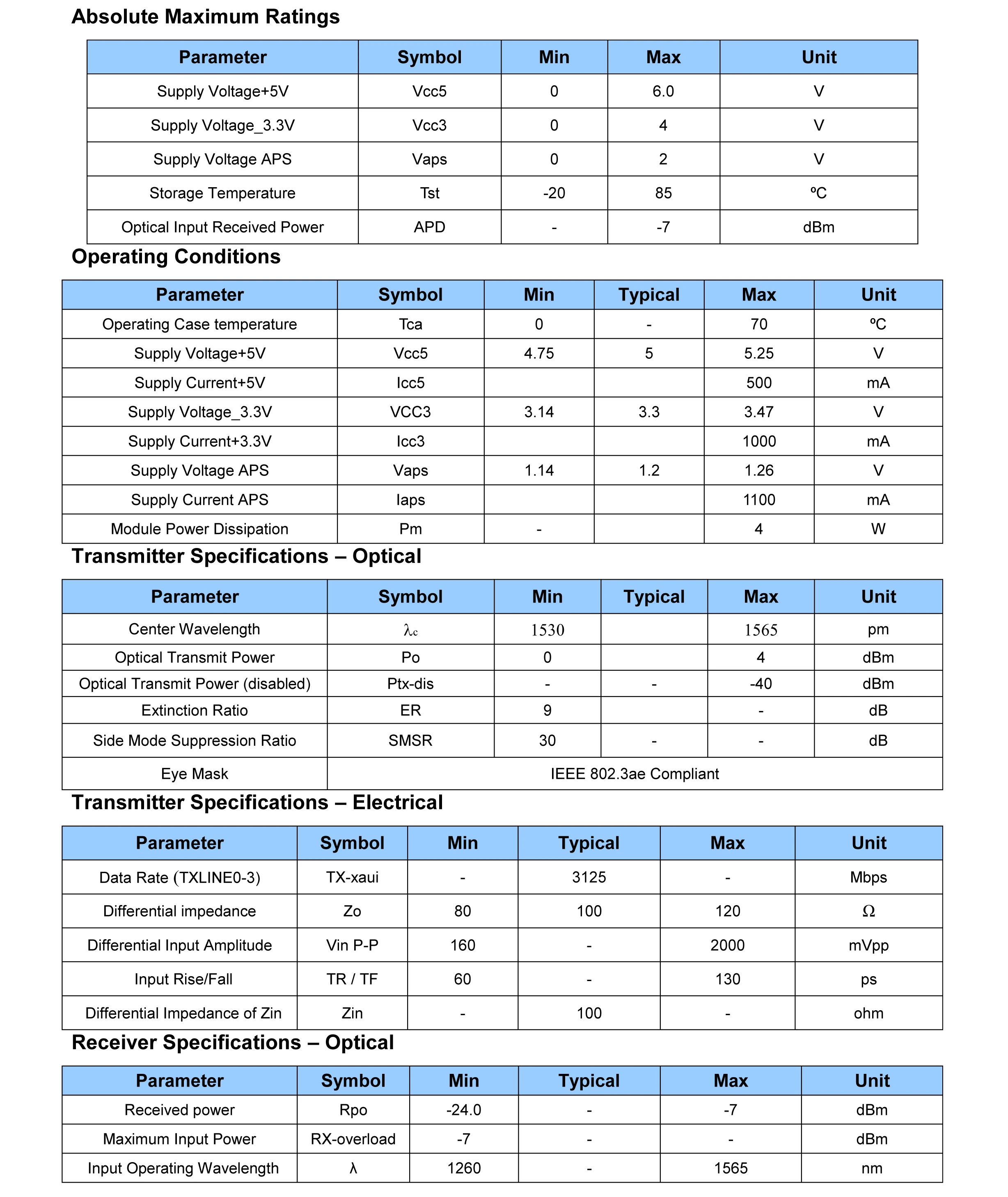Features ►Compatible with XENPAK MSA Rev.3.0 ►Support of IEEE802.3ae 10GBASE-LR ►Transmission Distance up to 10km(SMF) ►Uncooled directly modulated 1310nm DFB Laser ►Temperature Range 0 to 70°C ►Adaptable Power Supply (APS:+1.2V) ►SC duplex Optical connector ►Hot pluggable 70-pin connector with XAUI electrical interface ►Management and control via MDIO 2-wire interface ►Compatible with RoHS Applications ►10GBASE-LR 10G Ethernet Product Description The XENPAK is a highly integrated、Serial optical transponder module for high-speed, 10Gbit/s data transmission applications. 4×3.125Gbps Ethernet Signal Input by XAUI Interface.An integrated Coder / Decoder and multiplexer / demultiplexer (SERDES: Serializer / Deserializer). Designing for 10GBASE-LR Transmission with an uncooled directly modulated 1310nm DFB Laser. The transponder operates within a wide case temperature range of 0°C to +70°C and offers optimum heat dissipation and excellent electromagnetic shielding which enables high port densities for 10 GbE systems. A 70 pin electrical connector and a duplex SC connector optical interface assure that connectivity is compliant to the XENPAK MSA Rev.3.0.