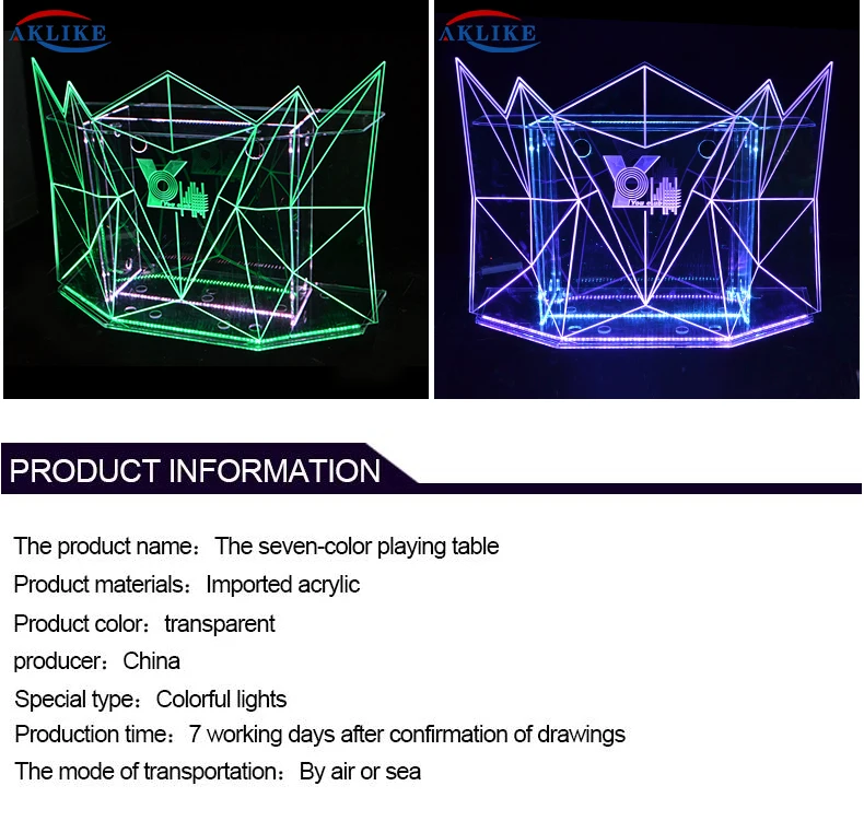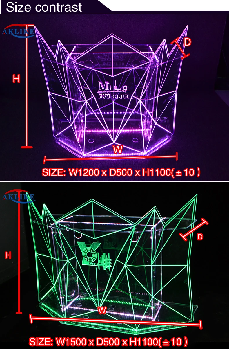 Product Code TN-D040 Material Acrylic/ PMMA / Lucite Color transparent, red, dark blue,light blue,purple, green,yellow and white Logo Use different ways to make according to your logo Size 150*50*90CM / Customized LED Lights colors, can flash and gradual change, controlled by remote Thickness 6-10mm or customized Packing PE plastic wrapped, honeycomb carton board support inside, master carton box Payment T/T , Western Union
