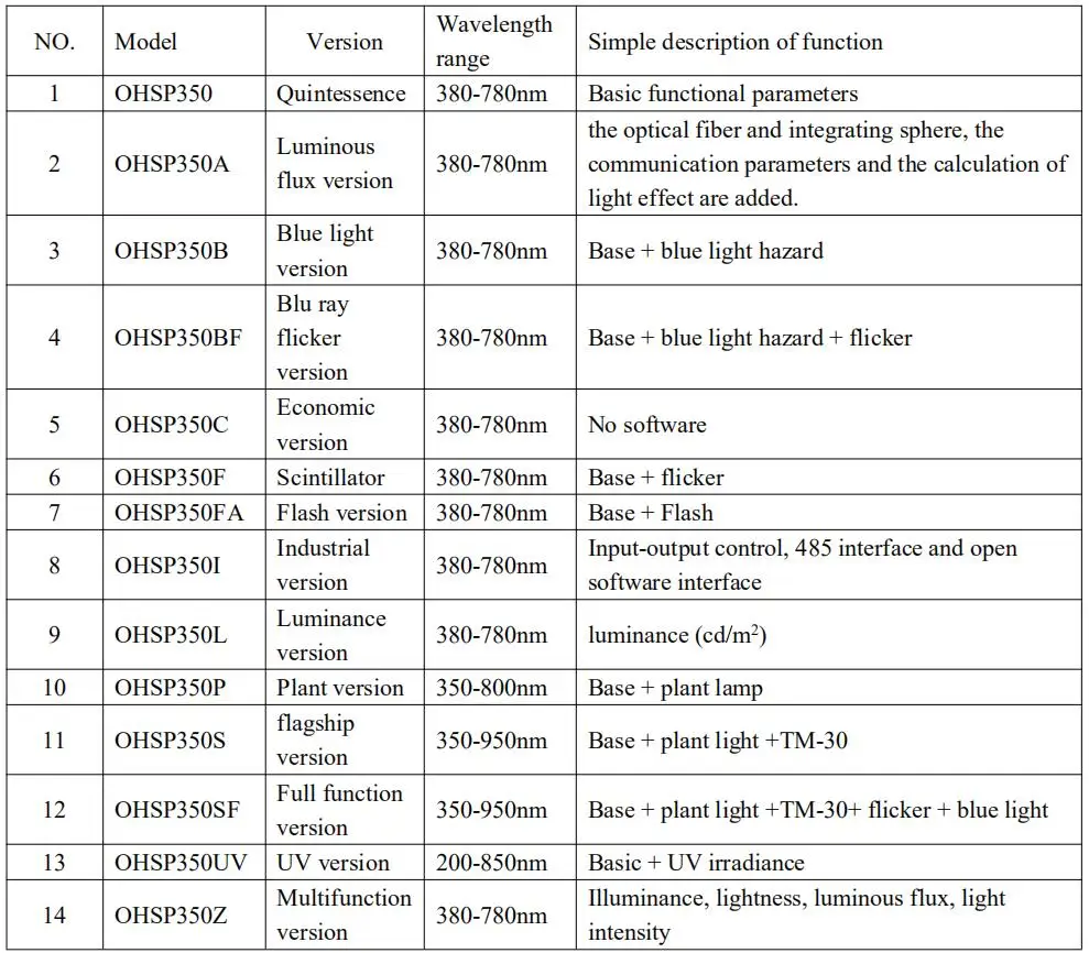 1. Отклонение CCT Tc (K) и Blackbody Duv 2. Светильник E (LX), светильник свечи E (Fc) спектральное излучение Ee (W/m2) 3. Цветовые координаты (x, y), (U, V), (U ', V') 4. Относительное спектральное распределение мощности P (лямбда) 5. Индекс Цвета Ra, Ri (i = 1 ~ 15) 6. Цветовая погрешность SDCM 7. Преобладающие длины волн, пиковые длины волн 8. Визуальное соотношение светильник и тени S/P 9. Чистота цвета, красный коэффициент, зеленый коэффициент, синий коэффициент, CIE1931 три основных цвета стимулирующее значение X, Y, Z 10. Более функциональные параметры могут быть настроены