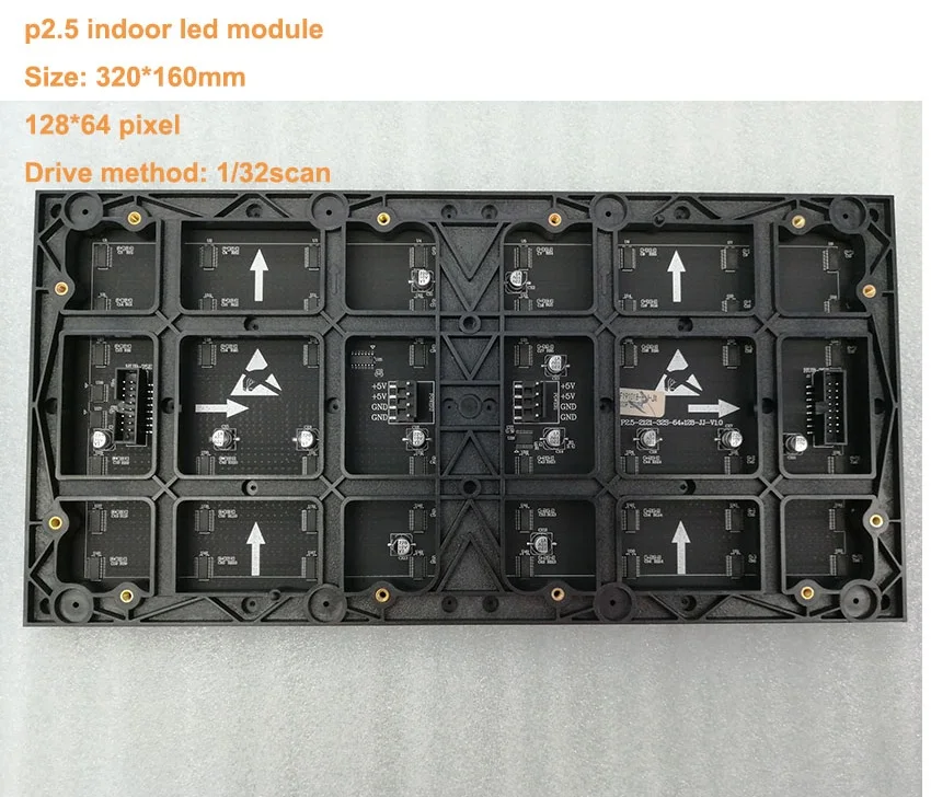 Шаг: 2,5 мм Плотность: 160000dot/sqm Светодиодный инкапсуляции: SMD2121 Размер модуля: 320*160 мм Разрешение модуля: 128*64 пикселей Метод привода: 1/32 сканирования Цвет: полный Цвет Яркость: ≥1800cd/sqm Серый сканирование: ≥ 4096 Угол обзора: 140/140 Рабочая Напряжение: DC5V (Чип на плате) Срок службы: 100000 часов Гарантия: 3 года Система управления: LINSN/ZDEC/DBSTAR/NOVA/COLORLIGHT