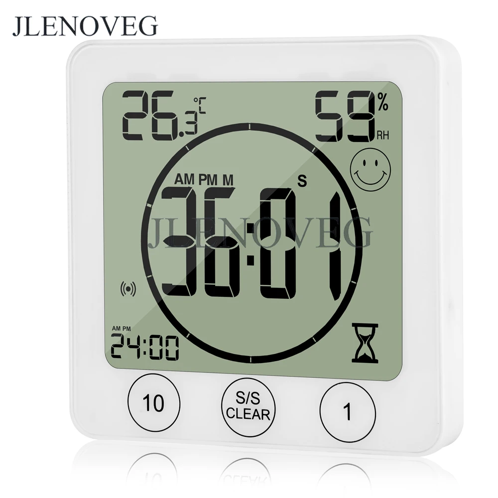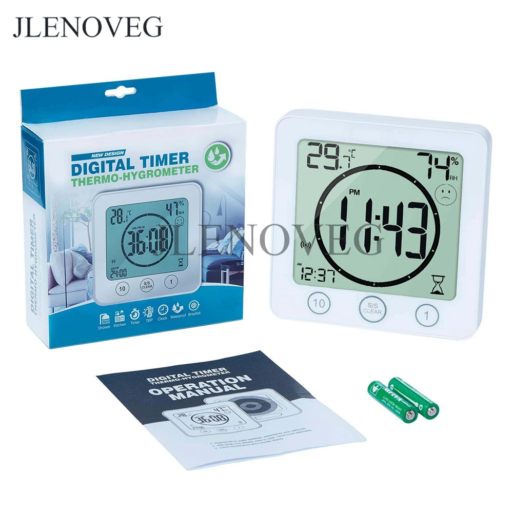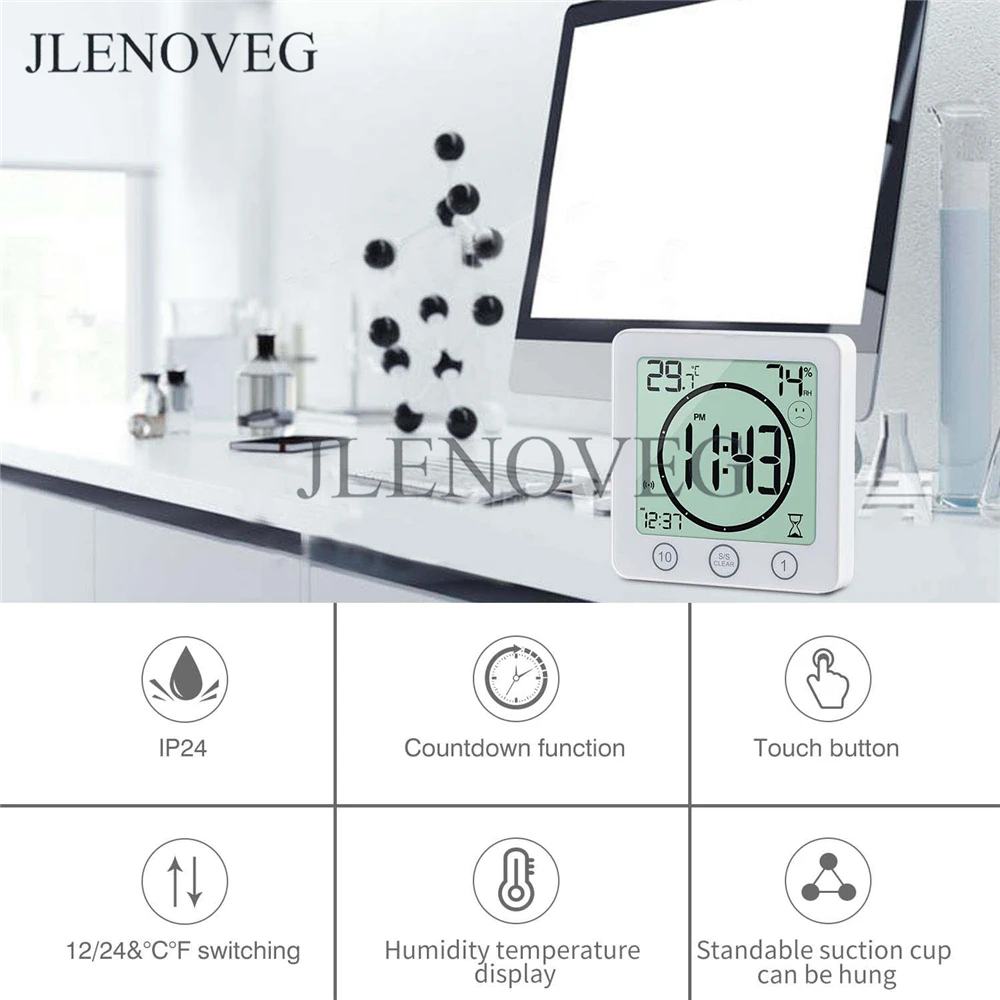 Waterproof Bathroom Clock and Timer for Shower, Digital Water Resistant Shower Alarm Clocks with Suction Cup, Water Proof Bathroom Hanging Wall Clock Humidity Temperature Meter Touch Screen