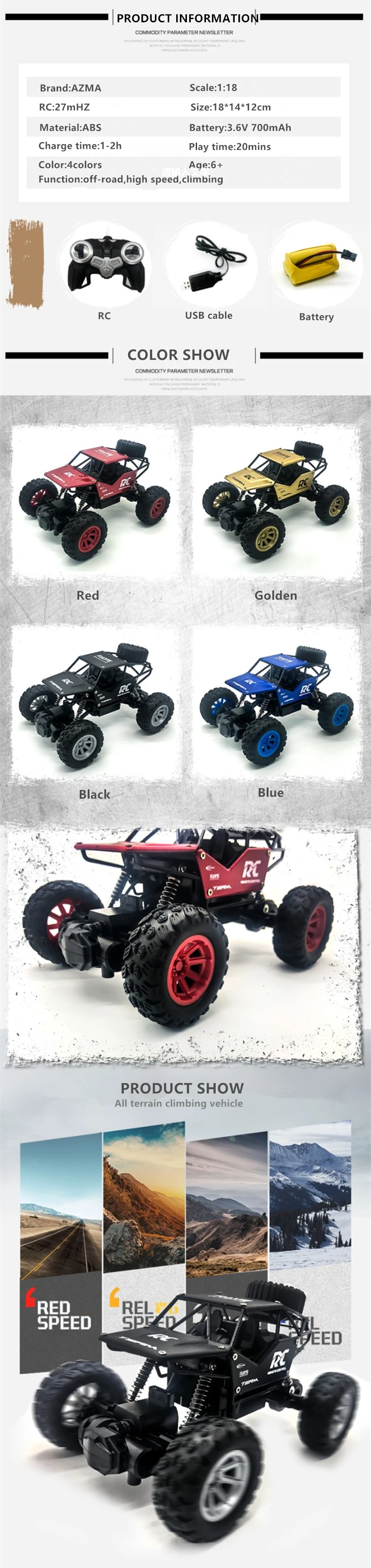 Бренд: AZMA Размер: 20*14*12 см Материал: металл, АБС высокая скорость: 15 км/ч Батарея: 3,6 В 700 мАч NI-CD Масштаб: 1:18 (мини) Время работы: 20 минут Время зарядки: 2 ч Зарядное устройство: USB кабель (5 В 1-2A) RC: 27 МГц RC диапазон: 30 м