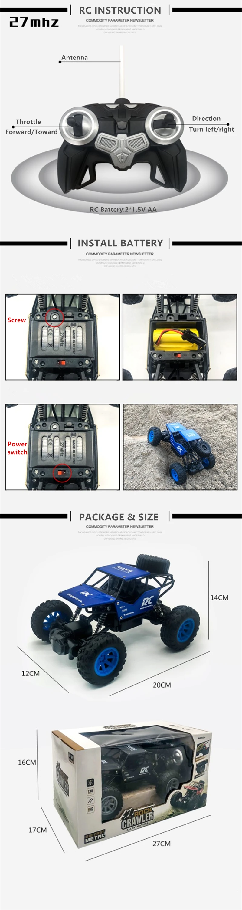 1,1: 18 Мини RC автомобилей (Размер: 20*12*14 см) 2. Около 20 минут воспроизведения (Время зарядки: 1-2 ч) 3. Безопасный материал ABS 4. 4WD и двойные двигатели 5. USB кабель, RC, автомобиль, инструкции 6. Легко управлять, высокая скорость, альпинизм, внедорожный