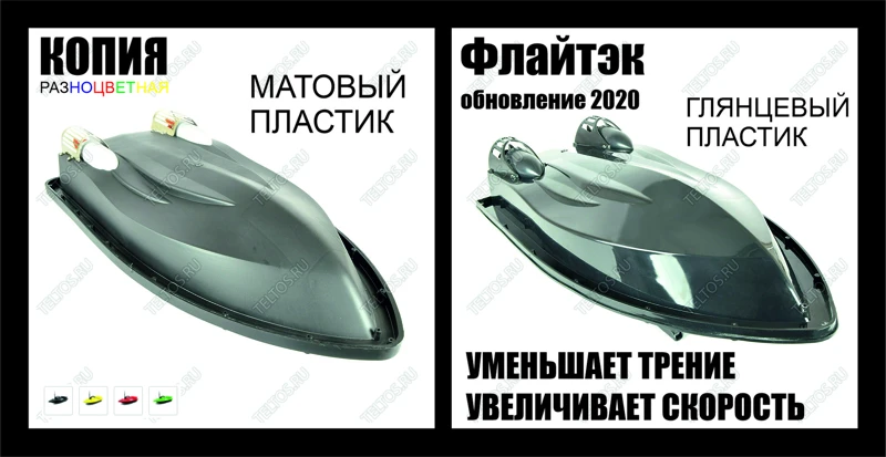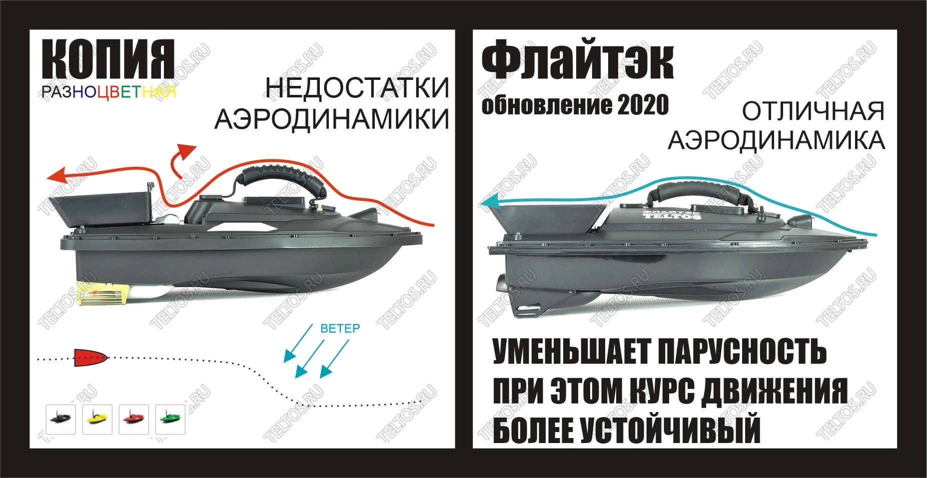 Инженеры Флайтэк не дремлют и не дают возможности обойти их цветными копиями. Каждый год создавая новые модели или модернизируя модели, которые были хитами. -Полусопло. Во время движения без груза винты меньше захватывают воздух. Из-за этого уменьшается шум от пузырьков и всплесков. Полусопло направляет струю воды, фокусируя её,увеличивает тягу и КПД крутящего момента движителя. -Дополнения и изменение 2020: -Трехлопастные винты - увеличивают скорость! -В версии 2020 TELTOS исправлены проблемы с приёмом сигнала на дальних дистанциях -Установлены новые разноосные двигатели. Менее шумные -Металлические элементы сервоприводов. Исключают риск износа механизмов -Обтекаемый дизайн корпуса, для лучшего преодоления сопротивления и водорослей; -Возможность установки эхолота для дальней заброски; -Корпус из прочного, качественного ABS пластика;