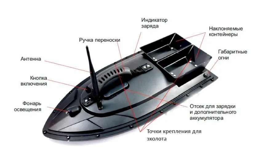 Вмещает до 1,5 кг прикормки. Кораблик оснащен 2 специальными лотками для сброса прикормки. Емкость каждого лотка позволяет вместить 750 грамм прикормки для карпа. Выполнен из прочного ABS-пластика. Корпус из прочного ABS-пластика прошел «краш-тест» на волнах длиной 1 метр. Кораблик не боится ни дождя, ни мелких камней, ни даже небольшого града и стойко противостоит не только механическим травмирующим, но и химическим разрушающим факторам. Цифровая система дистанционного управления. Кораблик оснащен прорезиненной антенной. Дистанционный пульт осуществляет передачу сигналов на частоте 2,4 ГГц. Дальность управления составляет до 500 метров, но в плохую погоду и с подсевшим аккумулятором дальность управления уменьшается. Оснащен двумя независимыми винтами. Кораблик способен развить скорость до 90 м/мин. Если кораблик загружен по максимуму и установлена защита на винты, скорость снижается. Система освещения. Для удобства на носу установлен светодиодный ночной фонарь, а на корме 2 габаритных светодиодных огня. Регулировка освещения осуществляется непосредственно с пульта. Запас хода до 2 км. Кораблик оснащен литиевым аккумулятором емкостью 5200 мА/ч. Для работы пульта управления используются 4 батарейки типа АА. Заряженные на 100% аккумуляторы обеспечивают запас хода до 2 км.