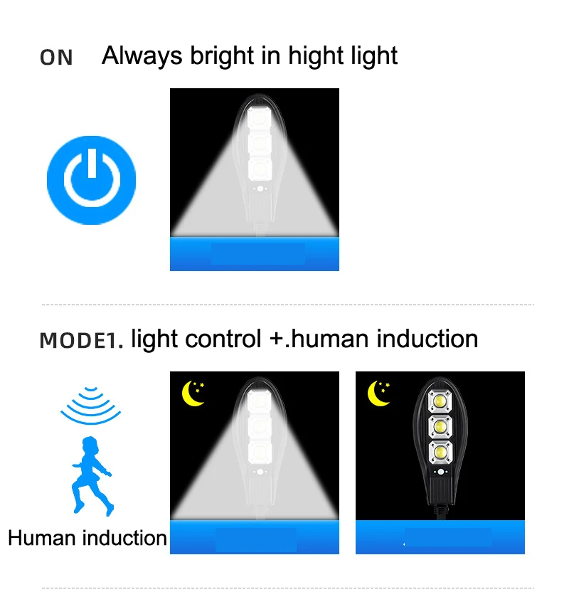 Режим 1: тусклсветильник + индукция человека + управление светильник Том. Он автоматически включает тусклсветильник ночью, когда люди приближаются около 3-5 м, он включит ярсветильник на 20-25 с, затем автоматически включит тусклсветильник. Режим 2: индукция человека + управление светильник Том. В ночное время или в темное время он автоматически включает светильник при обнаружении человеческого движения и задерживает 20-25 секунд, когда люди выходят из зоны чувствительности, он выключается. Режим 3: Светильник Том. Он автоматически включит светильник в ночное время или в темное время суток, а также автоматически выключится в дневное время или на ярком месте. 4. №: светильник
