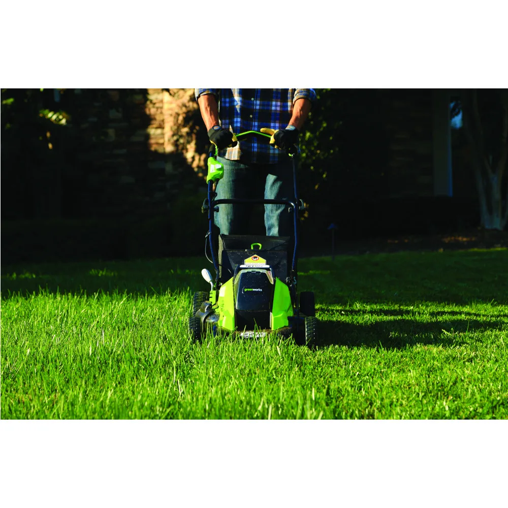 Газонокосилка аккумуляторная Greenworks линейки устройств 40 вольт (модель G40LM45) - вполне сопоставима по своим характеристикам с бензиновыми газонокосилками и имеет ширину скашивания 45 см. Она обладает функцией мульчирования, сбора травы в травосборник и функцией бокового выброса травы. Приемник травы объемом 50 литров, имеет металлический каркас и индикатор заполнения травой.