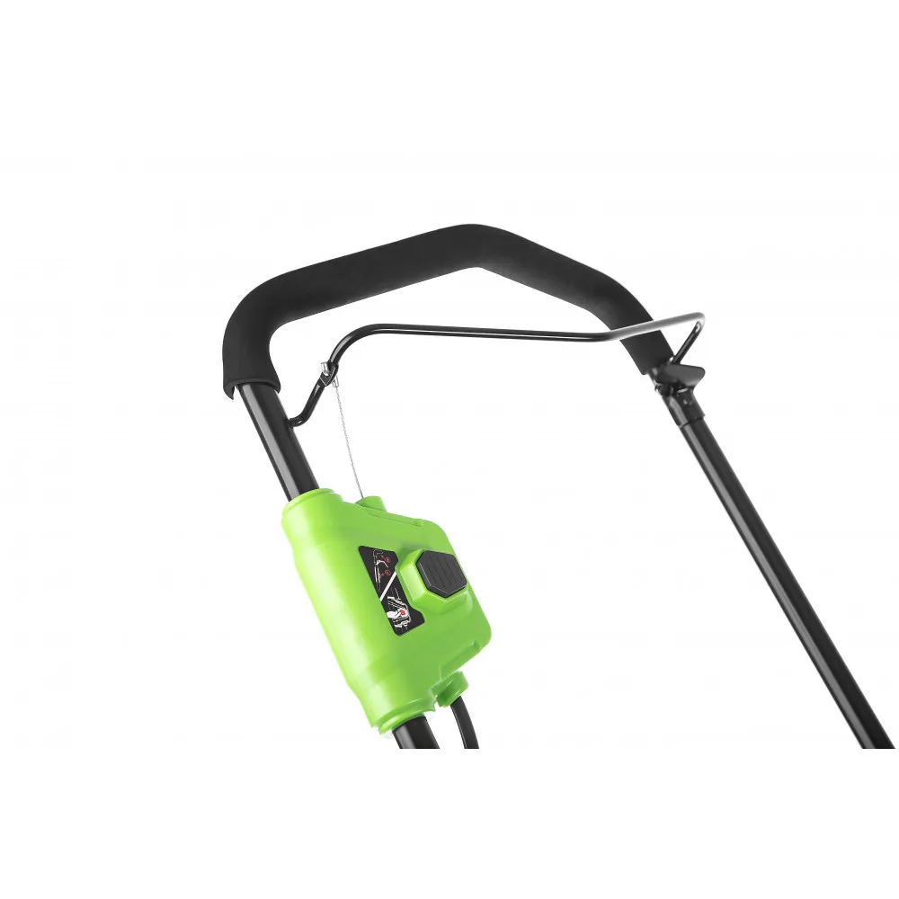 Автономное время работы - до 500 м² от 4 А.ч. батареи (примерное время работы, и зависит от некоторых факторов). Для защиты от случайного включения, предусмотрен специальный ключ безопасности и кнопка-предохранитель. Для удобства хранения ручка газонокосилки складывается.