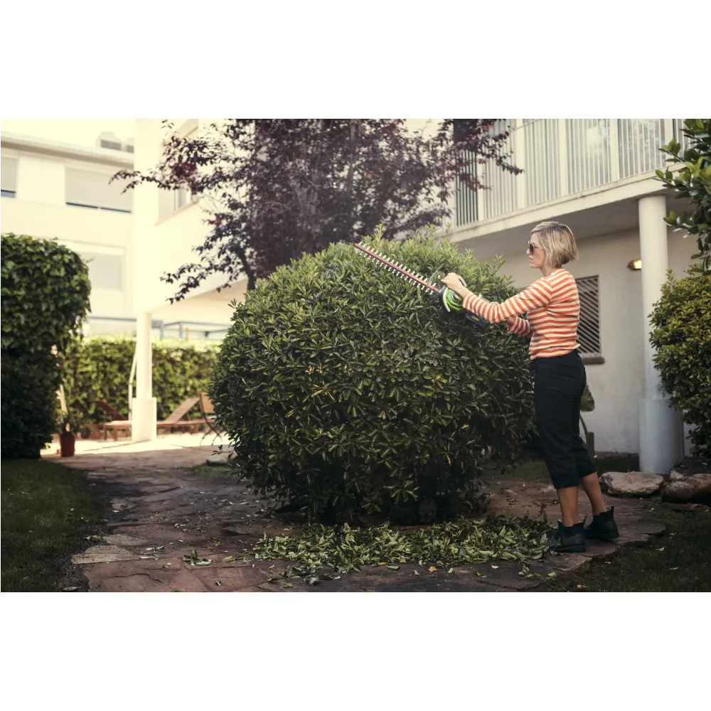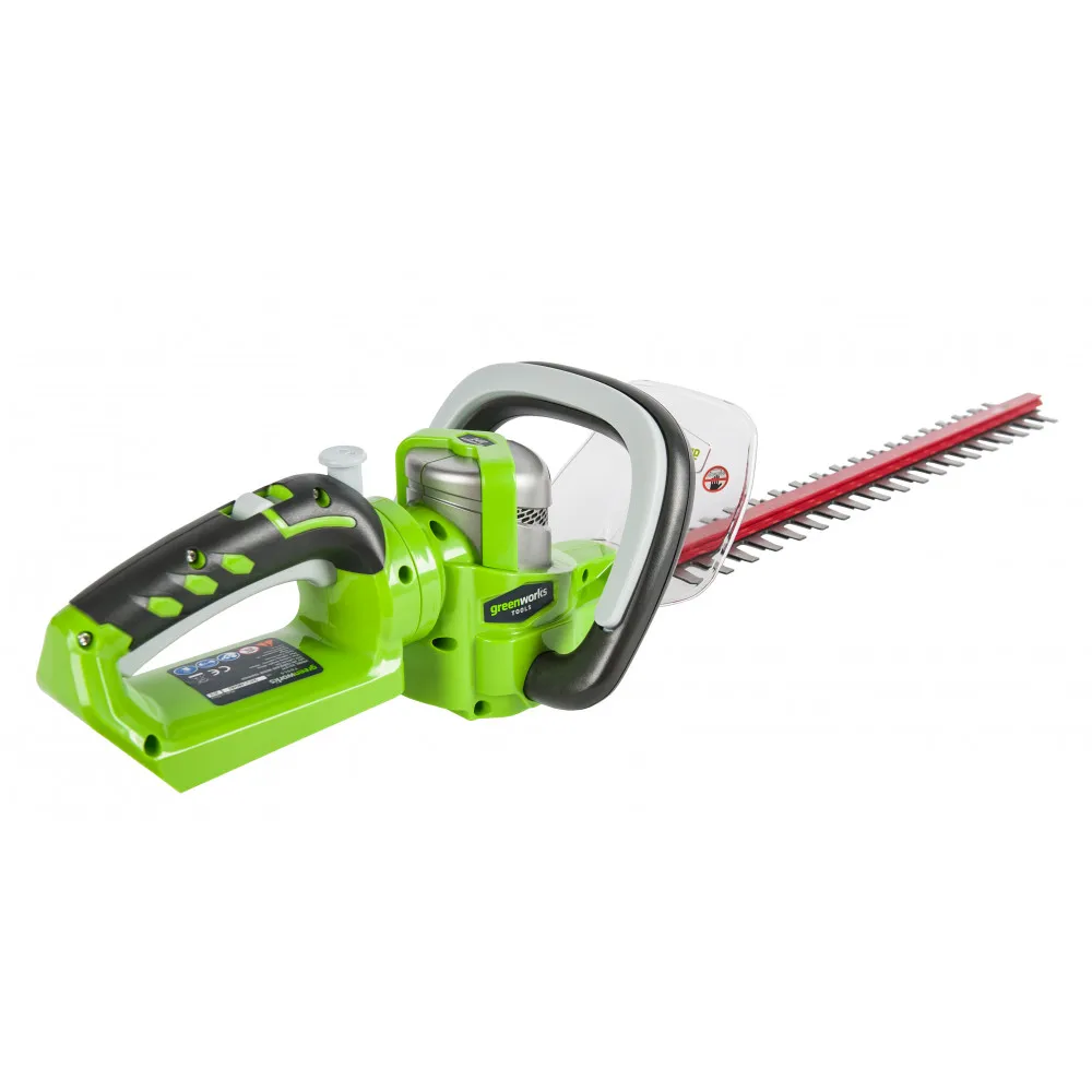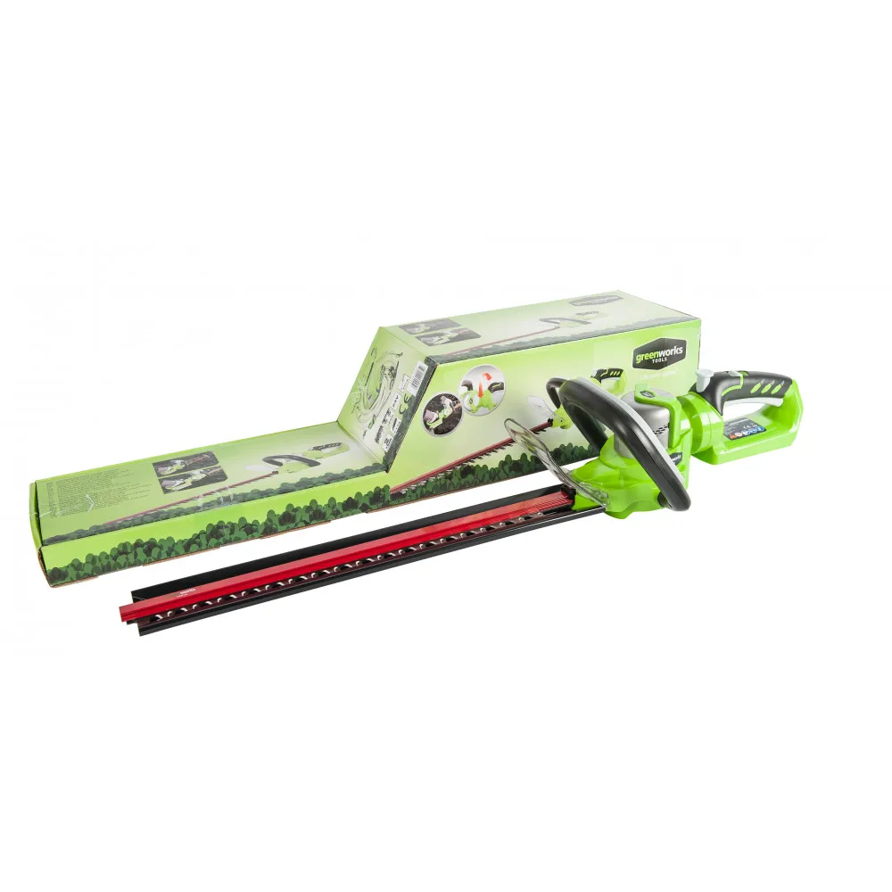 Кусторез аккумуляторный GreenWorks 24V (модель G24HT57) - легкий садовый инструмент. Предназначен для подрезки кустарника, живой изгороди или декоративных деревьев. Основным преимуществом данной модели является малый вес, по сравнению с бензиновыми аналогами (всего 2,7 кг.). Это отличная альтернатива бензиновому или электрическому кусторезу.