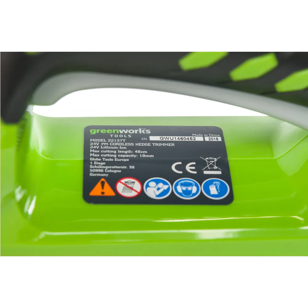 Данная модель оснащается системой, предотвращающей случайное включение, а также имеет защитный щиток рук. Кусторез относиться к системе устройств G-24V и работает от аккумуляторов Гринворкс 24V, которые подходят к более чем 20-ти устройствам, что позволит вам сэкономить на покупке дополнительных аккумуляторов если вы пожелаете приобрести какое-то устройство из данной линейки.