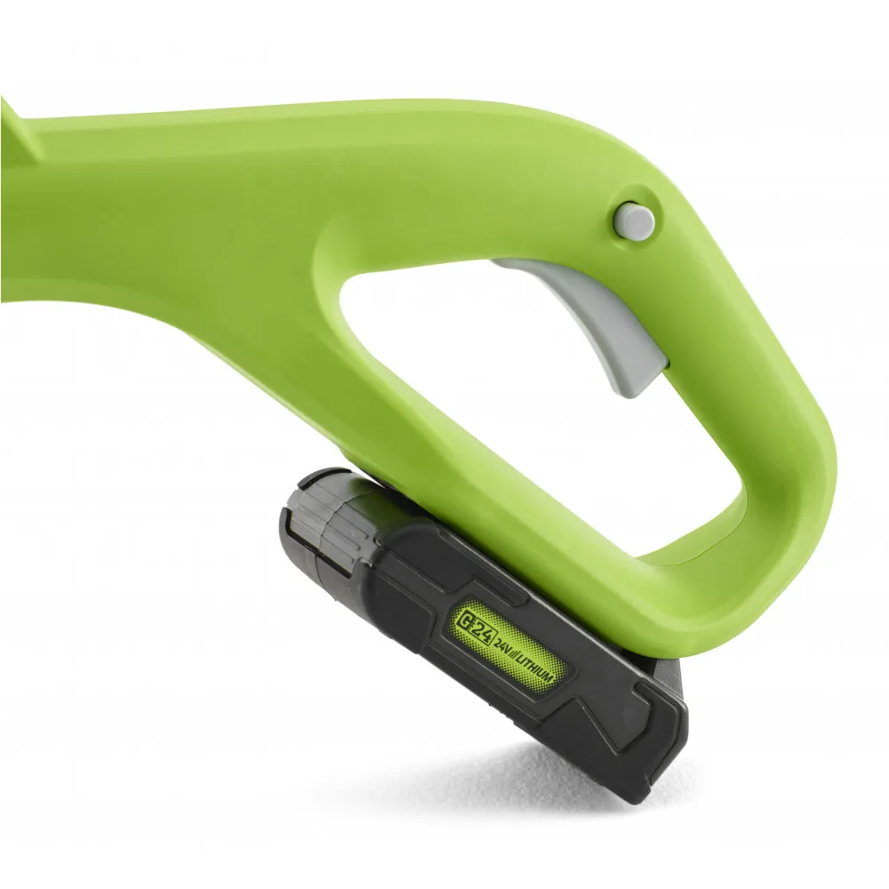 Ширина скашивания – 25 см, катушка имеет односторонний вывод лески 1,65 мм с автоподачей. Время автономной работы от 4 А/ч аккумулятора составляет до 40 минут. Двигатель инструмента оснащен защитой от перегрузок, а для защиты от случайного включения предусмотрен специальный предохранитель. Аккумулятор, который использует этот триммер, входит в линейку устройств Гринворкс G-24V и его можно использовать с более чем 20 устройствами из этой серии.