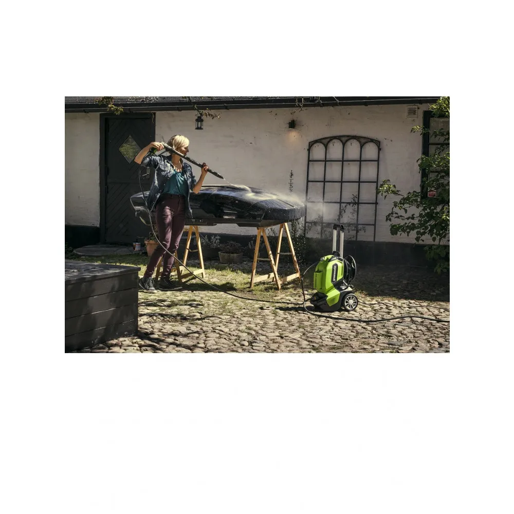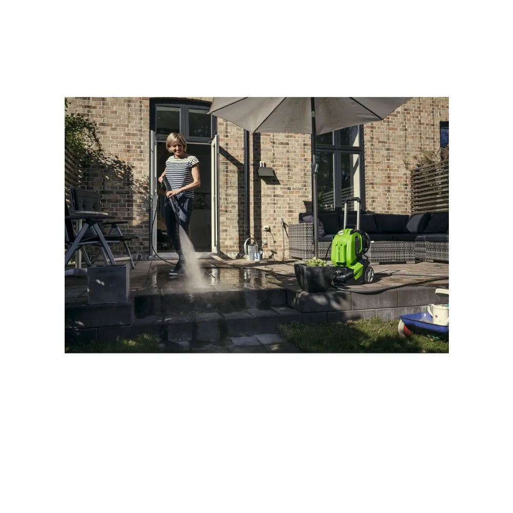 Мойка высокого давления Greenworks G40 — лучший вариант в среднем сегменте минимоек высокого давления Greenworks. Отлично справится с очисткой придомовых территорий, садового инвентаря, декоративных покрытий и, конечно, авто/мото техники.