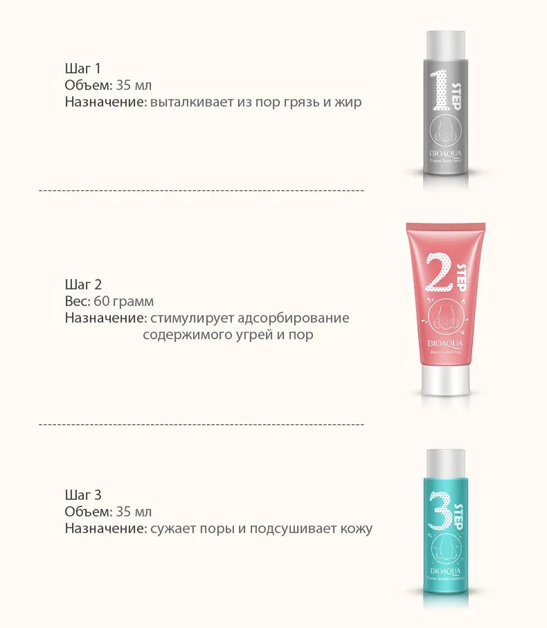 Поскольку 3-х ступенчатый набор для удаления черных точек Bioaqua состоит из трех косметологических средств, каждое из которых выполняет свою функцию, то действий у всего комплекса множество и это: