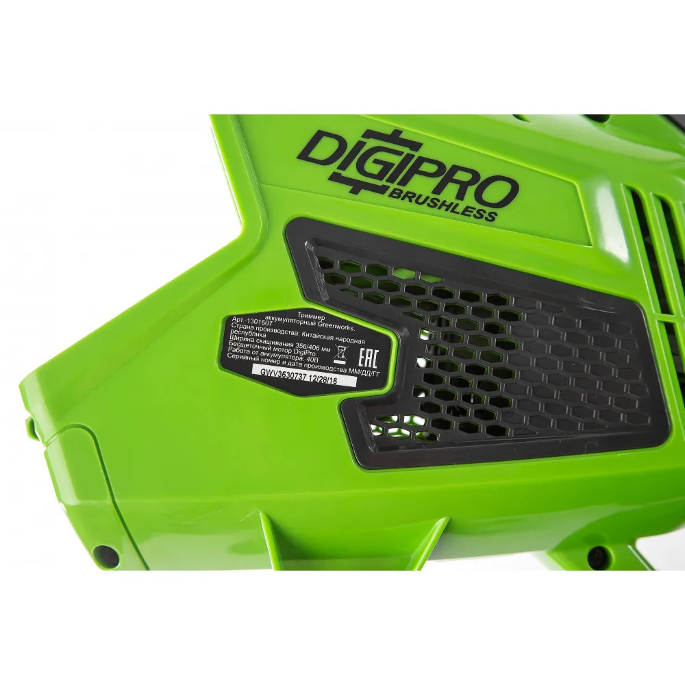 Бесщеточный двигатель DigiPro, наплечный ремень, упор в предплечье, 2 режима работы, плавный пуск и моментальная остановка, предохранитель от случайного включения, защитный кожух режущей части, защита от перегрузки, вал между двигателем и режущей частью - прямой и выполнен из стали, режущий диск в комплекте, работает от Li-Ion аккумуляторной батареи G-MAX 40V, которую можно использовать с другими устройствами линейки 40 вольт (15+ устройств).