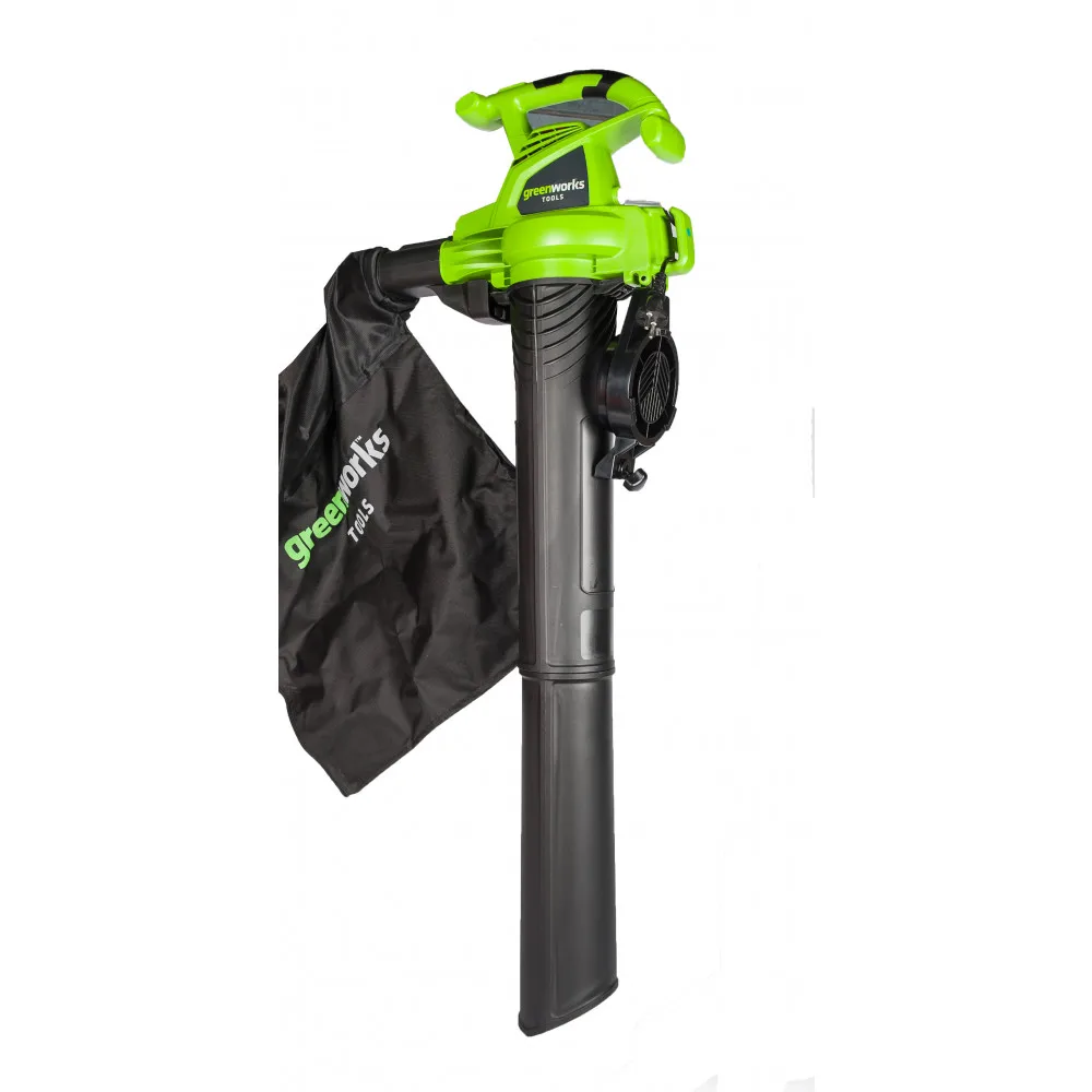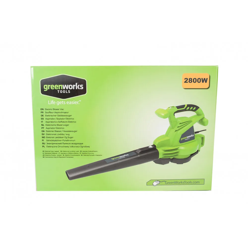 Воздуходув-пылесос садовый электрический Greenworks мощностью 2800W (модель GBV2800) - предназначен для уборки территорий от сухих листьев, пыли и другого мусора.