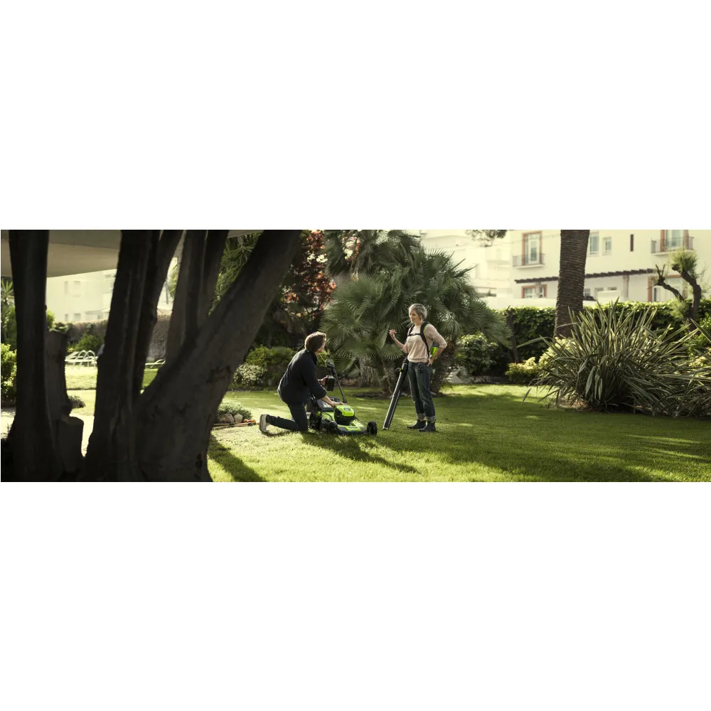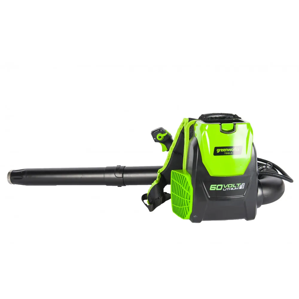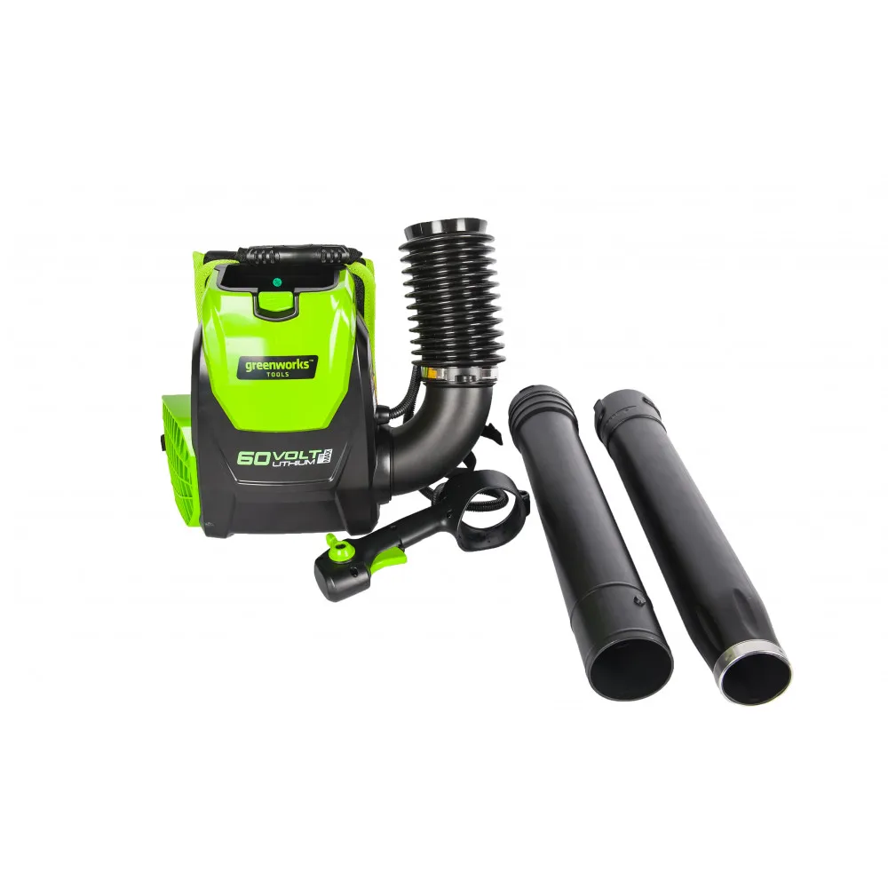 Для долговечной работы двигатель оснащен системой защиты от перегрузок. Модель имеет 2 скорости с плавной регулировкой на курке и с фиксатором, плюс турбо режим. Рукоятка прорезинена, чтобы рука не соскальзывала во время работы. Эта садовая воздуходувка работает от аккумуляторной Li-Ion батареи 60V, которая подходит ко всем устройствам из линейки Гринворкс 60V.