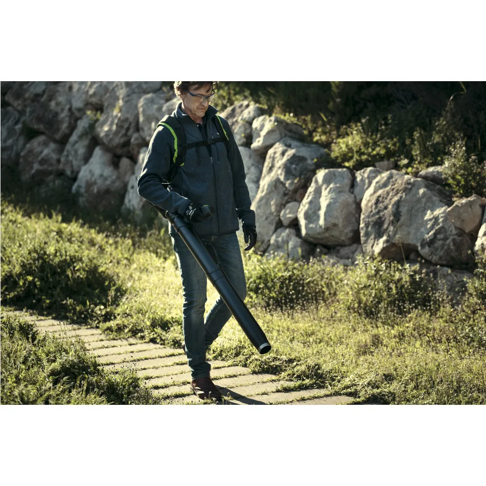 Основной особенностью является ранцевая конструкция воздуходувки, то есть аккумулятор и двигатель располагаются за спиной оператора, не нагружая его руку. В этой модели применяется бесщеточный двигатель последнего поколения DigiPro. Индукционный (он же бесщеточный) двигатель значительно надежнее обычного щеточного и не требует замены контактных угольных щеток. Более того, бесщеточный двигатель имеет сопоставимую мощность с бензиновыми аналогами, при этом не выделяет едкого газа загрязняющего атмосферу – СО, имеет пониженный уровень вибрации и шума. А главное - вам больше не придется заниматься обслуживанием инструмента, нет необходимости менять фильтры, масло, свечи или смешивать бензин с маслом для заправки. Также устройство не нужно заводить. Одним словом – максимум для вашего удобства.