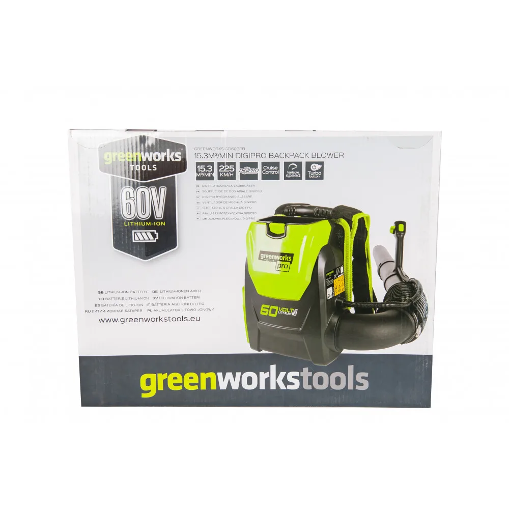 Воздуходувка ранцевая аккумуляторная Greenworks из линейки устройств 60 вольт (модель GD60BPB) – новинка 2017 года и отличный выбор для продолжительных работ по уборке территорий от опавших листьев, пыли и прочего мусора.