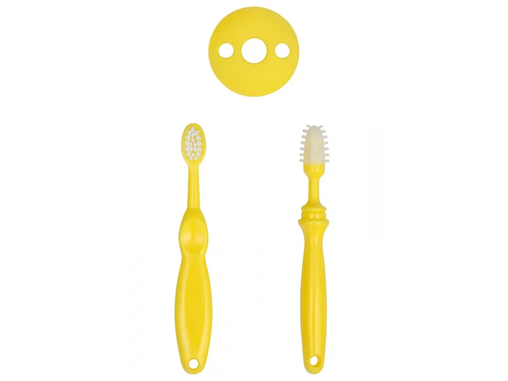 Набор из зубной щетки и массажера сделает уход за нежными деснами и первыми зубками малыша удобным и эффективным. Выполненный из гипоаллергенных, качественных материалов, набор полностью безопасен для малыша. Зубная щетка оснащена небольшой головкой и мягкой щетиной, которая бережно удаляет налет с детских зубов, а также аккуратно массирует десны. Щетка снабжена эргономичным держателем, удобно ложащимся в руку. Щетка-массажер помогает снять дискомфортные ощущения в период прорезывания зубов, уменьшить зуд и боль в деснах. Круглая головка оснащена двумя видами массажных зубчиков: широкими вертикальными и узкими горизонтальными. Такое расположение обеспечивает мягкий и безболезненный массаж, причем малыш может делать его самостоятельно, просто грызя массажер. Чтобы ребенок случайно не заглотил щеточку, на ручку устанавливается круглый ограничитель. Минималистичный дизайн обеспечивает простоту ухода за щетками. Набор очень легкий и компактный, поэтому при необходимости его можно брать с собой в дорогу, чтобы в любой момент у вас под рукой были необходимые малышу гигиенические принадлежности.