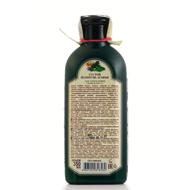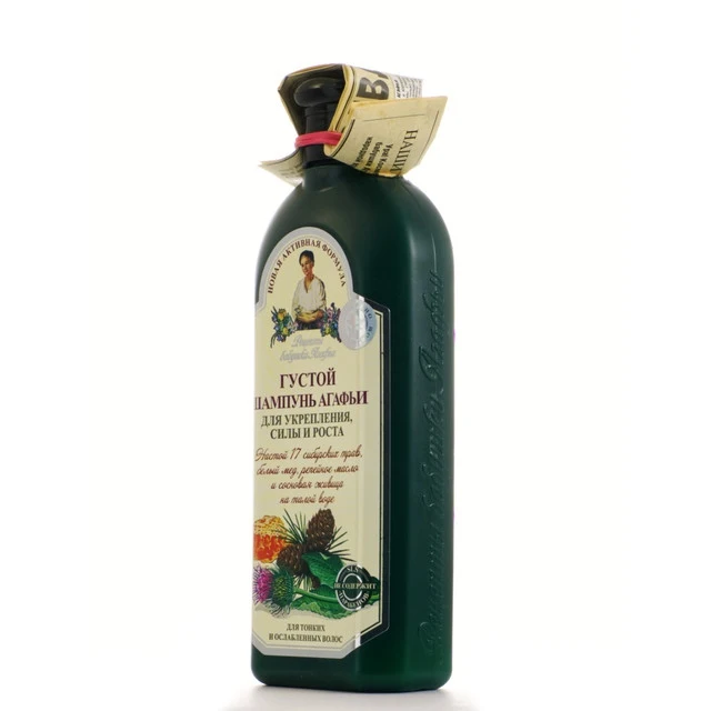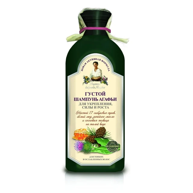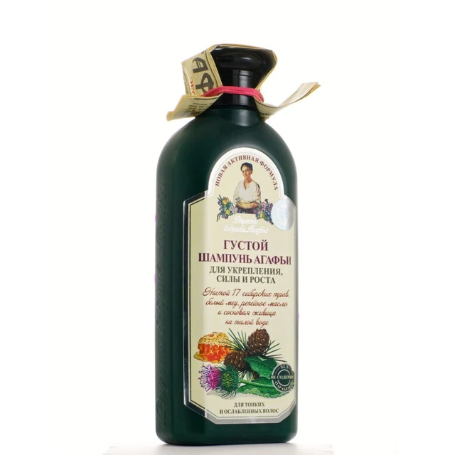 Густой шампунь Агафьи для укрепления, силы и роста волос создан на настое сосновой живицы на талой воде, сбора 17 сибирских трав, с добавлением белого меда и репейного масла.