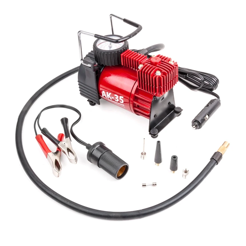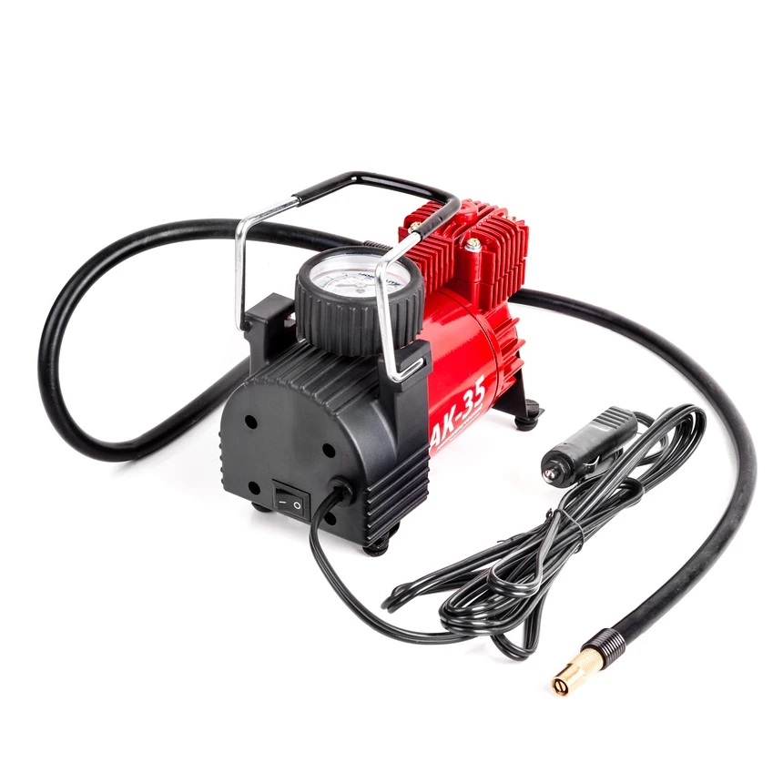Компактный автомобильный компрессор с поршневым насосом и встроенным манометром АК-35 — это отличный вариант для легкового автомобиля малого и среднего класса с диаметром шин до R14. Питание от бортовой сети (прикуриватель) или клемм АКБ (переходник в комплекте).