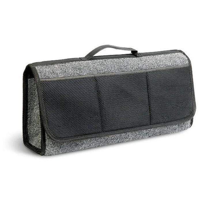 Автомобильный органайзер-сумка из ковролина. Цвет серый с характерной фактурой. Материал износостойкий и рассчитан на хранение в багажнике. В таком органайзере можно разместить автохимию, инструменты, автоаксессуары.
