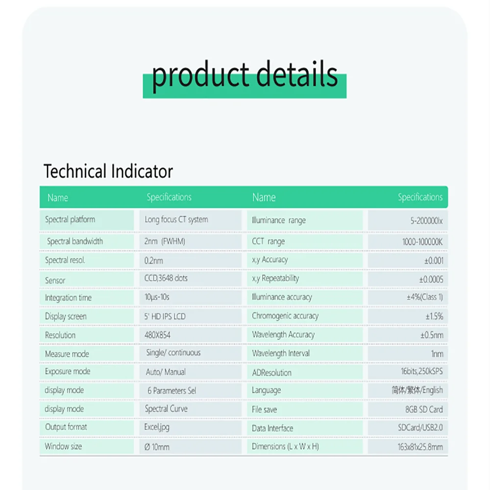 Measurement 1. CCT Tc (K) and Blackbody deviation Duv 2. light illumination E (LX), candlelight E (Fc) Spectral irradiance Ee (W/m2) 3. chromaticity coordinates (x, y), (U, V), (U ', V') 4. relative spectral power distribution P (lambda) 5. color index Ra, Ri (i=1 ~ 15) 6. color tolerance SDCM 7. Dominant wavelengths, peak wavelengths 8. Visual ratio of light and shade S/P 9. color purity, red ratio, green ratio, blue ratio, CIE1931 three basic color stimulus value X, Y, Z 10. more functional parameters can be customized