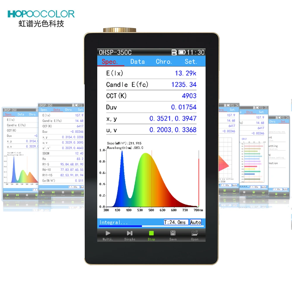 OHSP-350C Spectral irradiance colorimeter, integrated spectrum, CCT, CRI, Lux, irradiation .etc parameters in one. With 5 inch touch screen, Real-time display of measurement parameters and curves ,use convenient and fast.not only measure LED wide spectrum light source ,but also measure CFL、HID narrow spectrum light source.