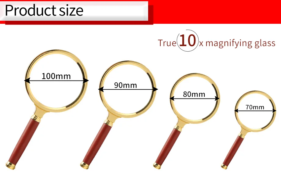 10X увеличительное стекло ручной 70 мм/80 мм/90 мм/100 мм Лупа Портативная Лупа для чтения ювелирных изделий газет Диаметр объектива: 70/80/90/100 мм Цвет: золотистый Материал: имитация античный из красного дерева, стекла, пластика Увеличение: 10x Посылка: 1 * увеличительное стекло Особенности: 1. Функция-это портативное увеличительное стекло 10x предназначено для дополнительной четкости и четкости, подходящей для просмотра небольшой печати или предметов. 2. Светильник фокусировки-может использоваться для фокусировки светильник, например, для концентрации солнечного излучения, чтобы создать горячее место на фокусе для запуска огня. 3. Стильный, эргономичный и легкий-вы можете просто скользить в кармане и использовать. Наше увеличительное стекло предназначено для ювелиров, техников по ремонту, наружных буффов, а также для тех, кто хочет читать или наблюдать крошечные детали текста или частей. Вы легко читаете маленький текст дома или изучаете карты во время их нахождения. 4. Применимо-идеально подходит для увеличительных ювелирных изделий, живописи, резьбы, ручной работы, штампов, шитья, ремонта небольшого размера, чтения мелкой печати на бутылках и так далее. 5. Оптическое стекло объектива-это 10х лупа для чтения с высоким коэффициентом пропускания, приносит четкое изображение и искажение без увеличения. 6. Премиум-дизайн-эта увеличительная линза поставляется с деревянной ручкой и пластиковой рамкой. Античный дизайн, который высылает небольшой ретро-вкус, всегда доставляет вам удовольствие. 7. Идеальный подарок-это увеличительное стекло с коробкой будет шикарным подарком на выбор, идеальный подарок для ваших друзей, пожилых людей или семьи. Примечание: 1. Пожалуйста, учитывайте разницу в 1-2 мм из-за ручного измерения, спасибо. 2. Из-за разницы между различными мониторами изображение может не отражать фактический цвет изделия