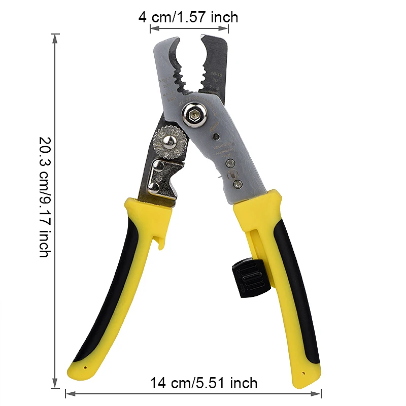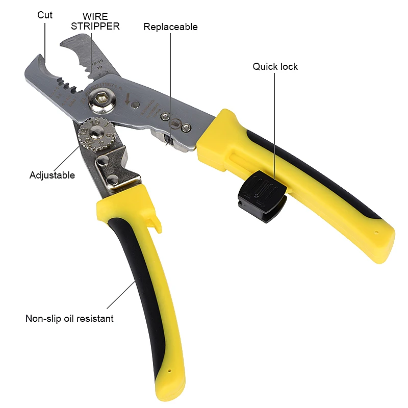 Porduct atrribute: многофункциональные автоматические плоскогубцы для зачистки проводов удобны в использовании, и нет необходимости устанавливать отверстие в соответствии с размером провода. Ручку размера провода можно отрегулировать в соответствии с требуемой прочностью, что удобно и быстро. Он высококлассный и практичный. TPR часть ручки разработана с изысканным противоскользящим узором, который имеет как ощущение, так и текстуру. Это необходимый ручной инструмент для электриков, ремонтных работников и обычных семей.