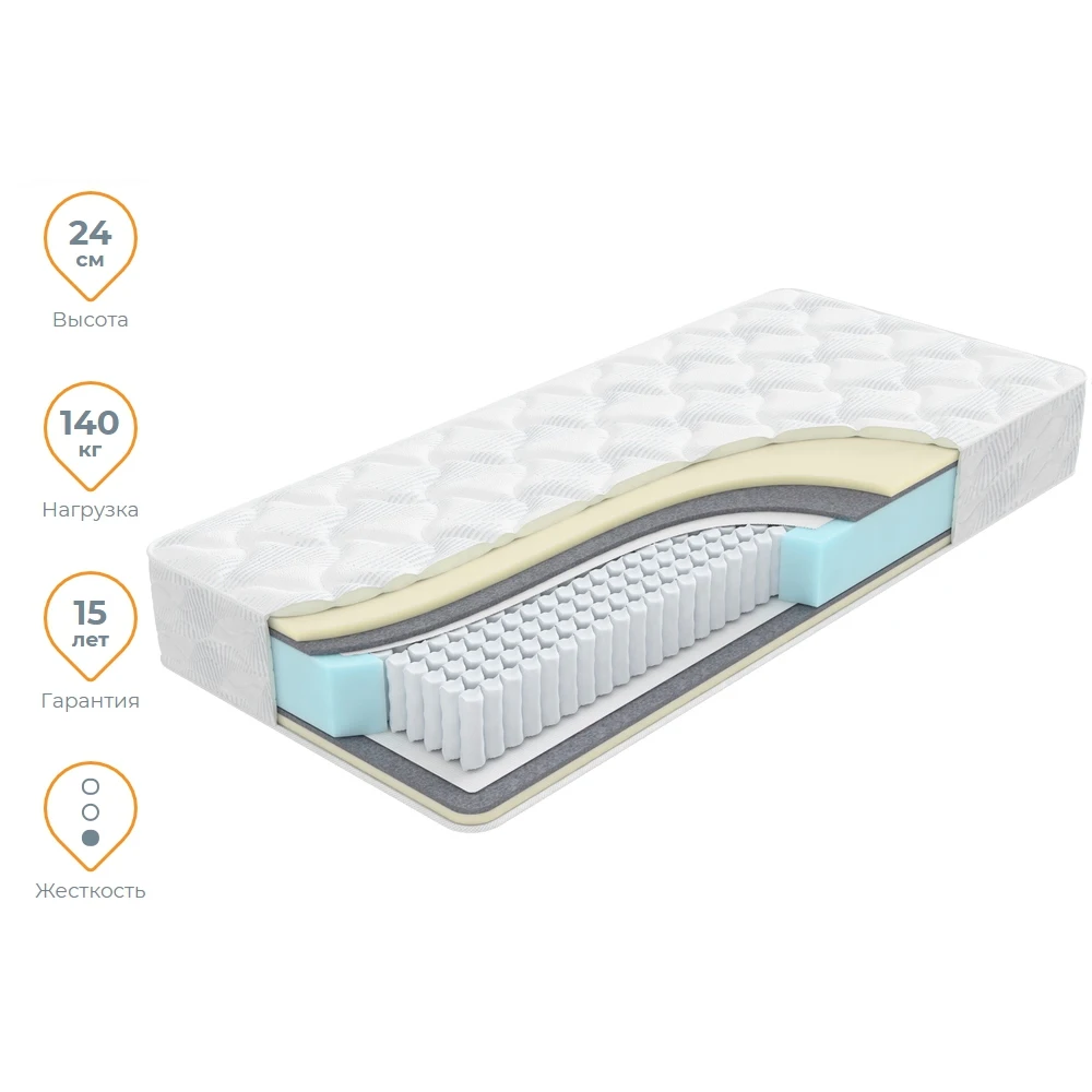 Матрас дарит быстрое снятие напряжения и расслабление мышц за счет мягкой, но упругой пены Latex Like. Объемный войлок придает матрасу комфортную жесткость и способствует лучшей циркуляции воздуха. Высота матраса 24 см, что идеально подходит к большинству современных кроватей.